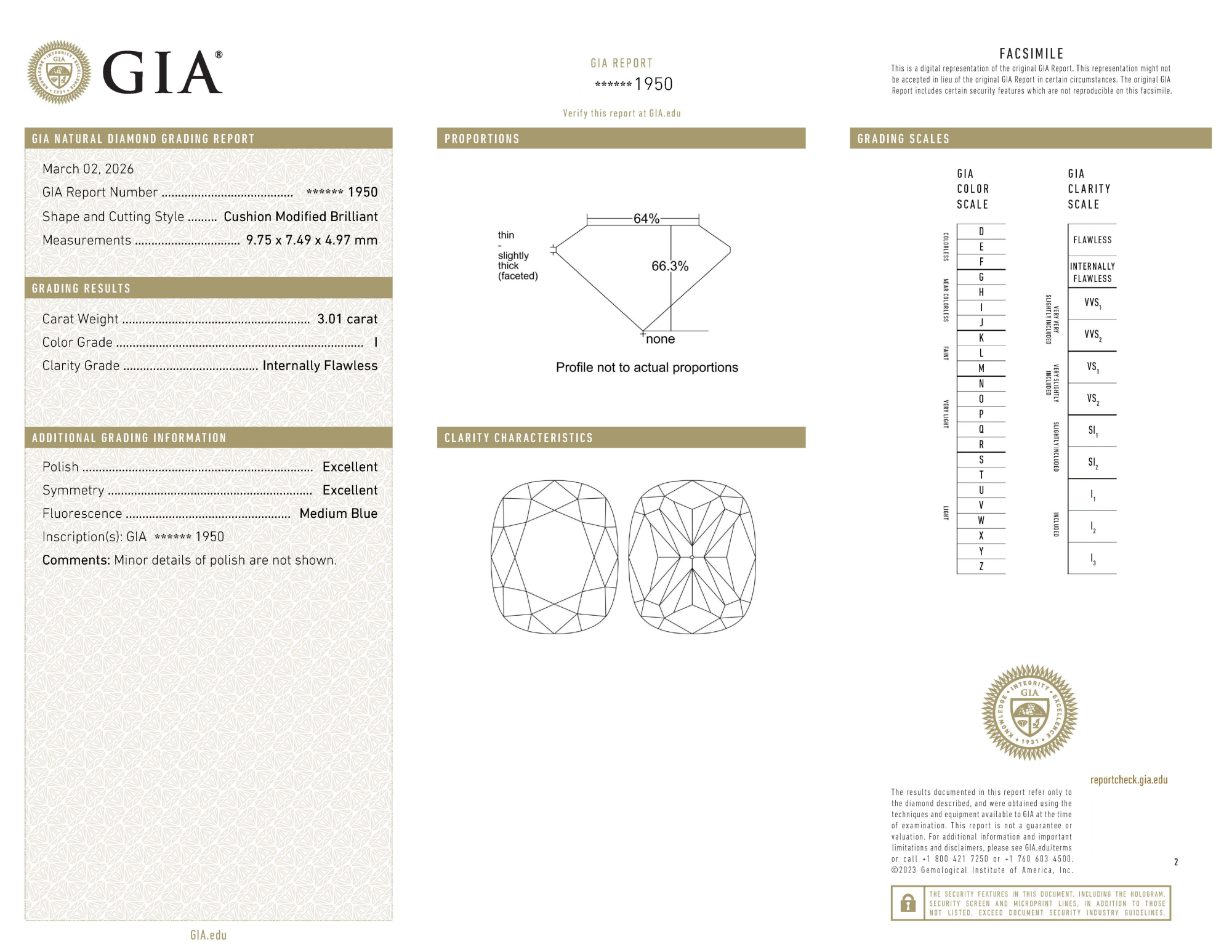 Your 3.01 carat Cushion natural diamond is graded IF clarity, which stands for Internally Flawless. Read more about IF clarity diamonds here, or learn more about diamond clarity in general here.