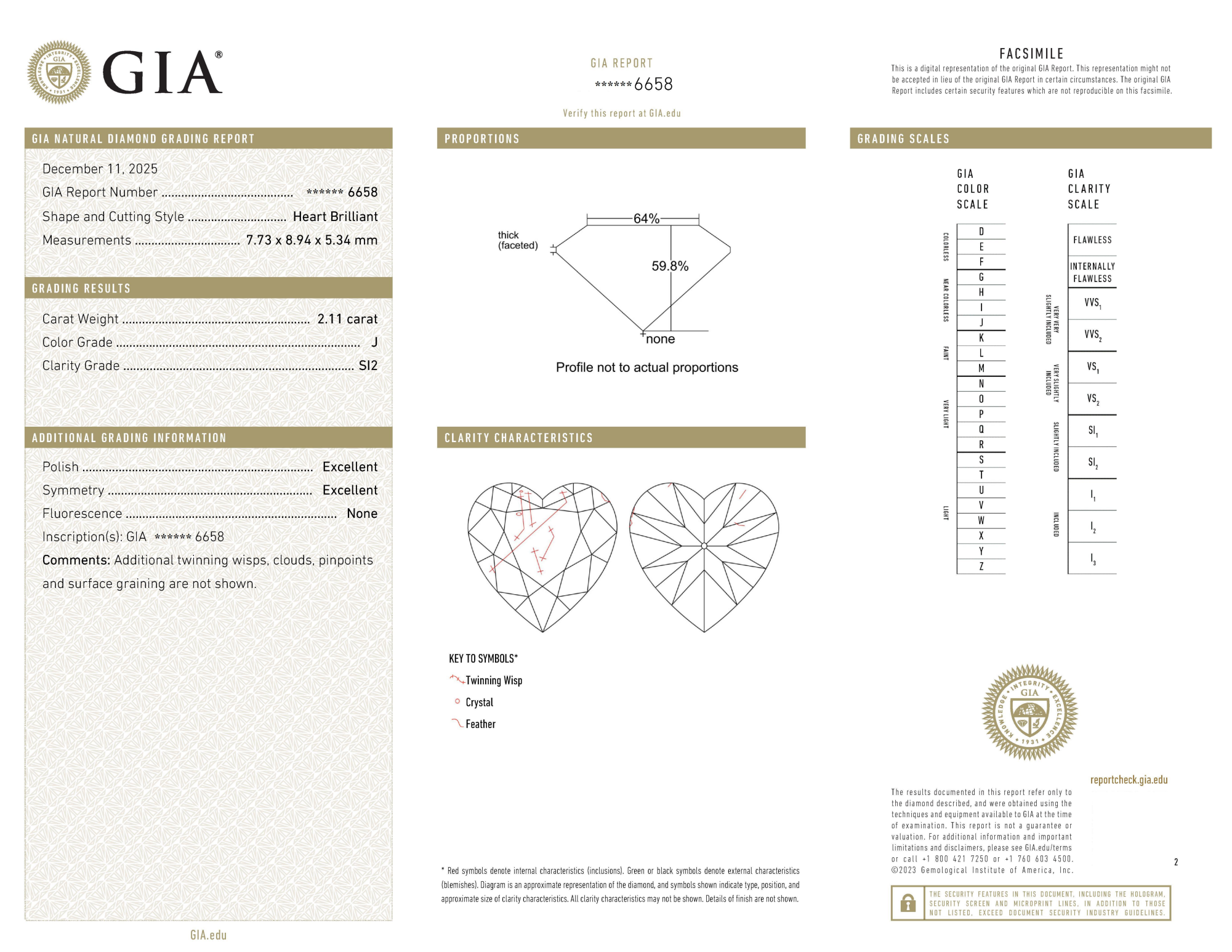 Your 2.11 carat Heart natural diamond is graded SI2 clarity, which stands for Slightly Included 2. Read more about SI2 clarity diamonds here, or learn more about diamond clarity in general here.