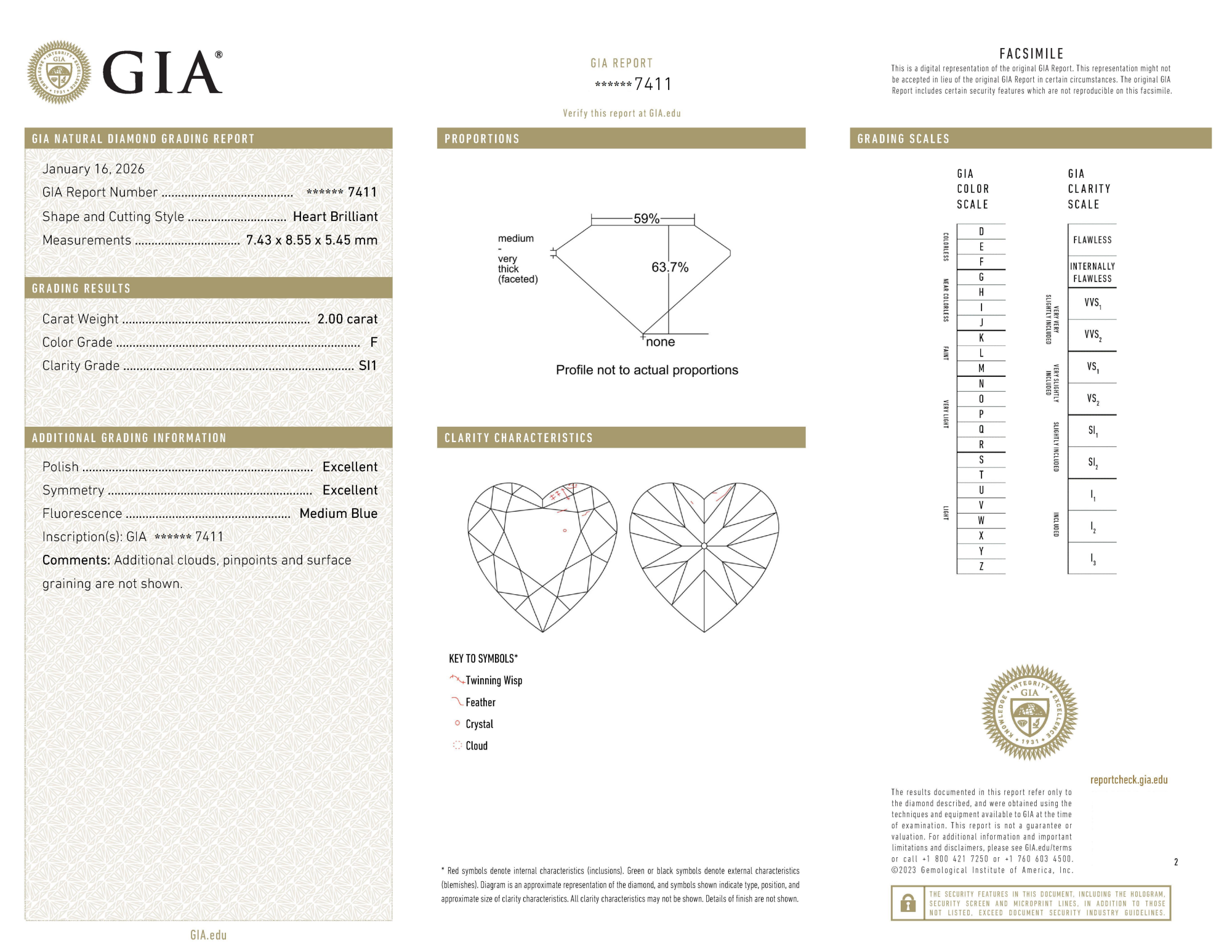Your 2.00 carat Heart natural diamond is graded F color (Colorless), and you can read more about F color diamonds here.