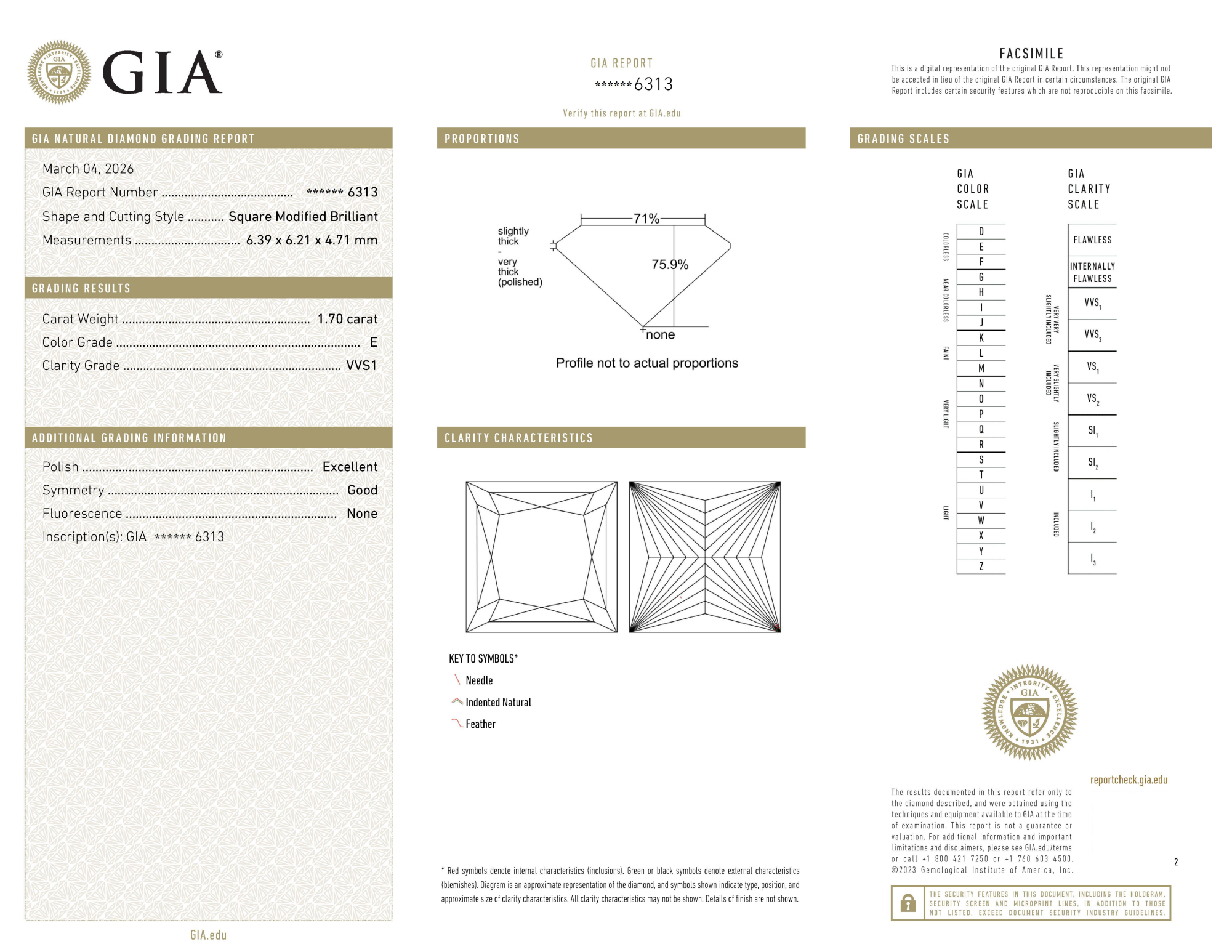 Your 1.70 carat Princess natural diamond is graded E color (Colorless), and you can read more about E color diamonds here.