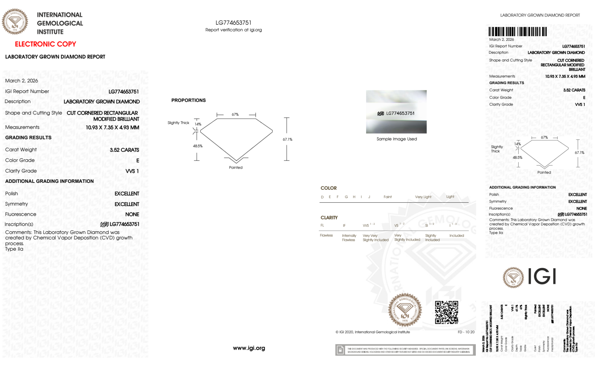 Your 3.52 carat Radiant lab diamond is graded E color (Colorless), and you can read more about E color diamonds here.