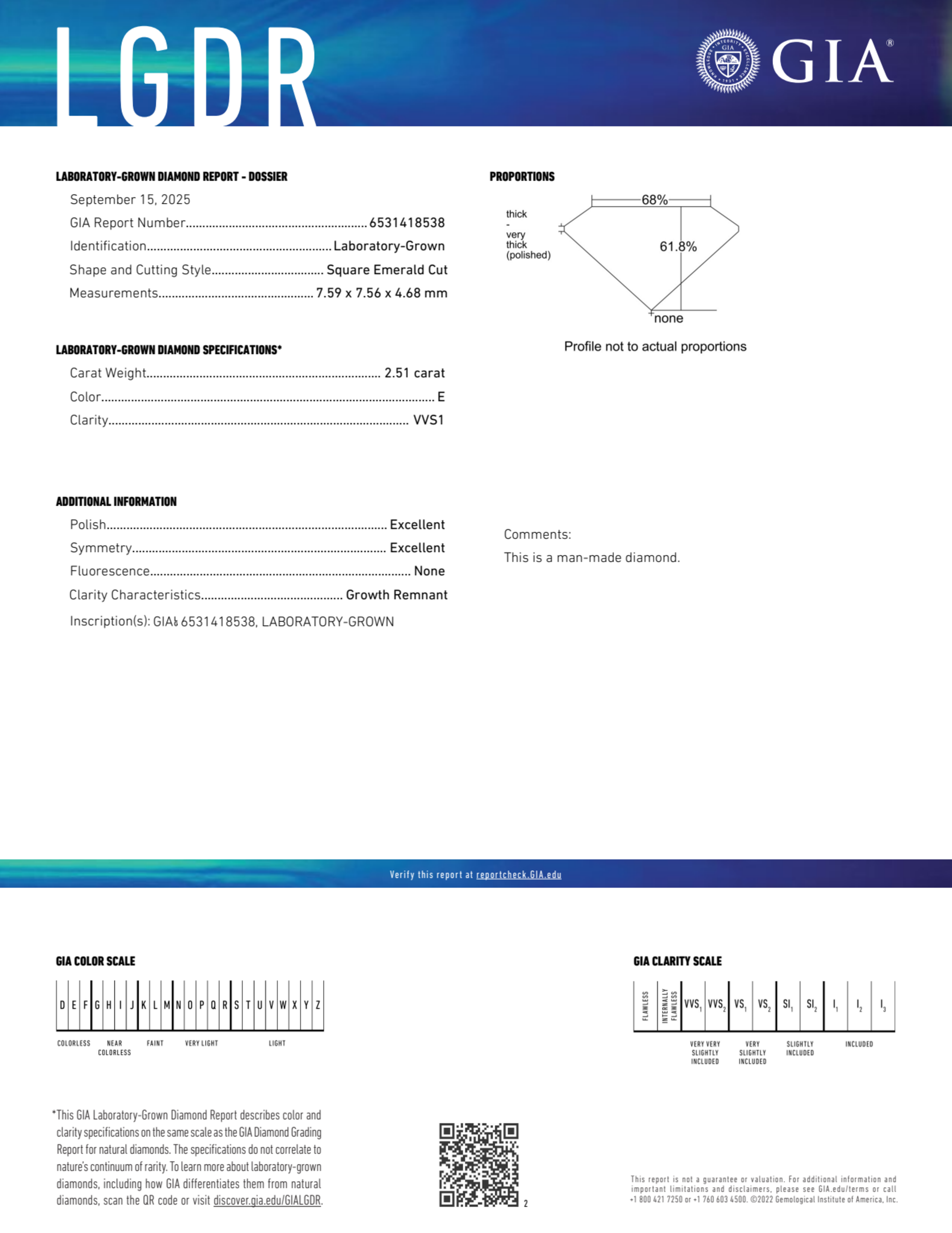 Your 2.51 carat Asscher lab diamond is graded E color (Colorless), and you can read more about E color diamonds here.