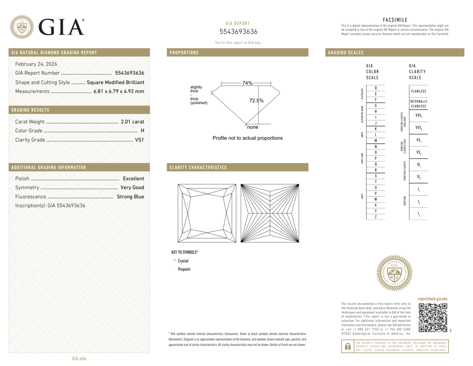 Your 2.01 carat Princess natural diamond is graded VS1 clarity, which stands for Very Slightly Included 1. Read more about VS1 clarity diamonds here, or learn more about diamond clarity in general here.