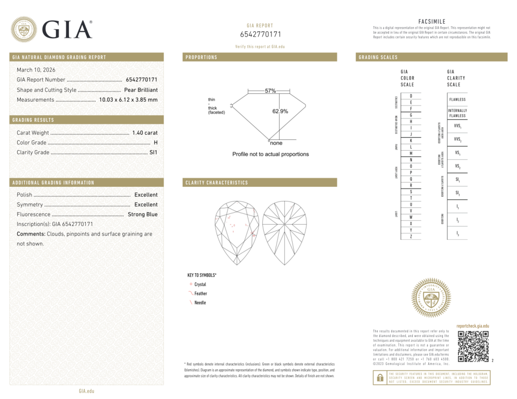 Your 1.40 carat Pear natural diamond is graded H color (Near Colorless), and you can read more about H color diamonds here.