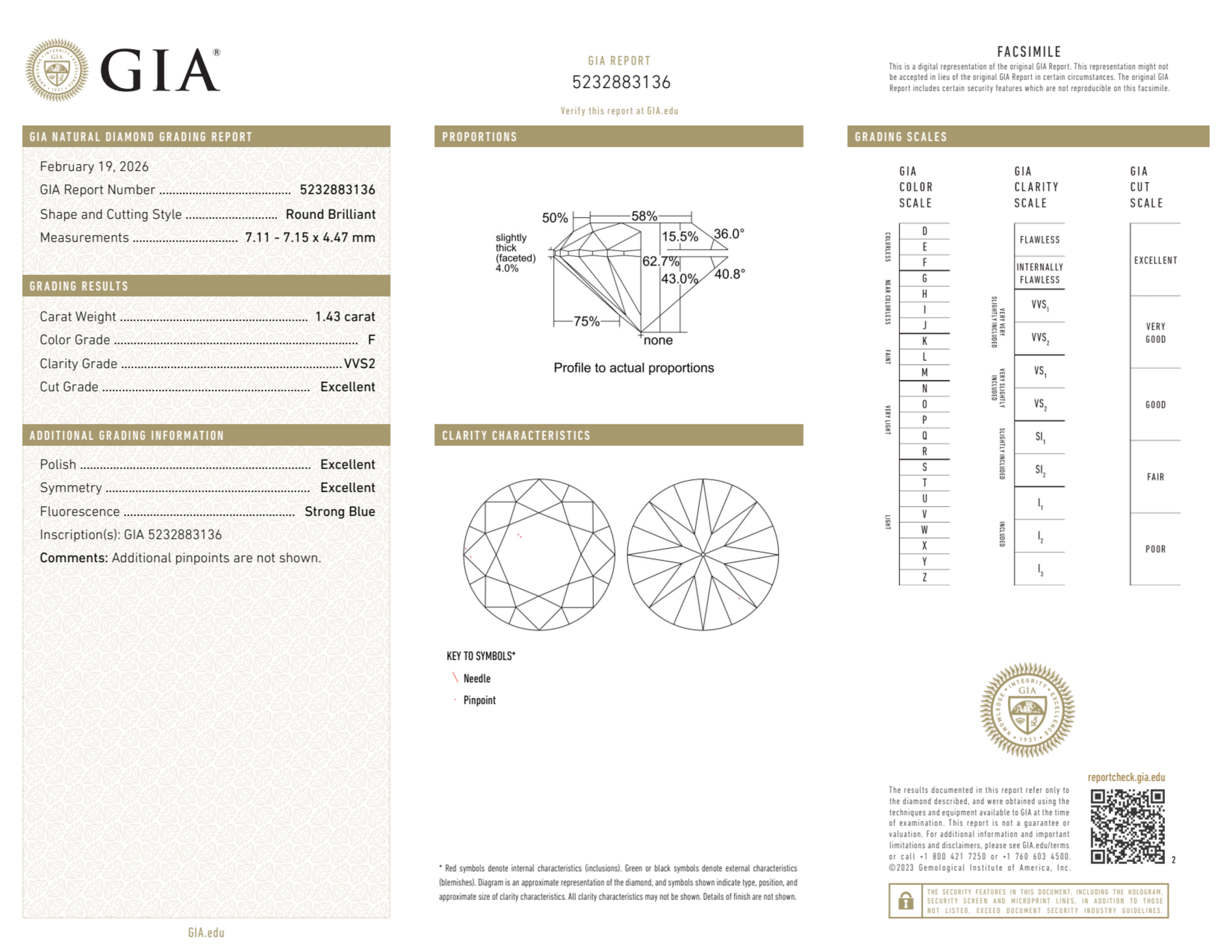 Your 1.43 carat Round natural diamond is graded F color (Colorless), and you can read more about F color diamonds here.
