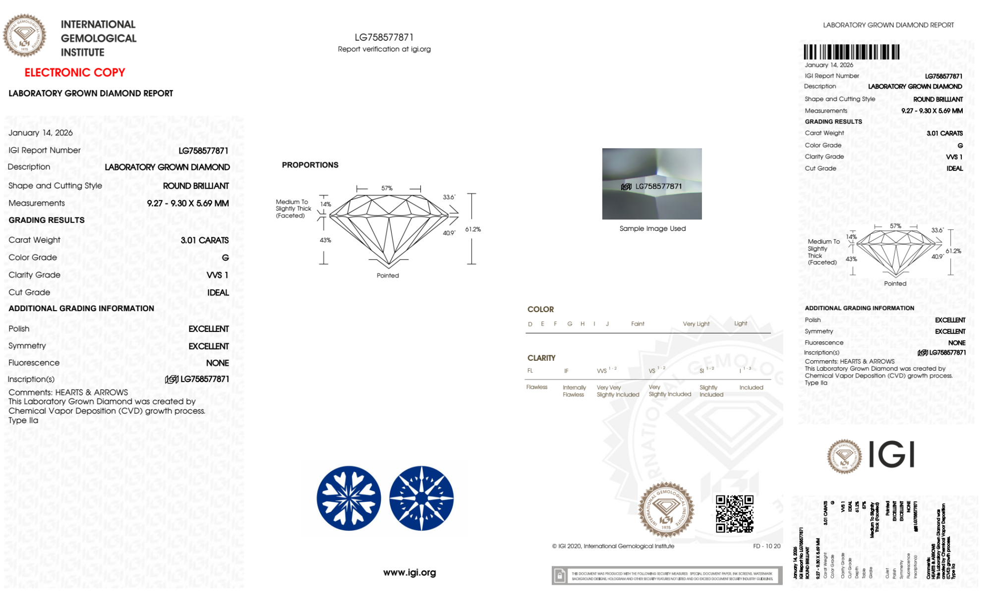 Your 3.01 carat Round lab diamond is graded G color (Near Colorless), and you can read more about G color diamonds here.