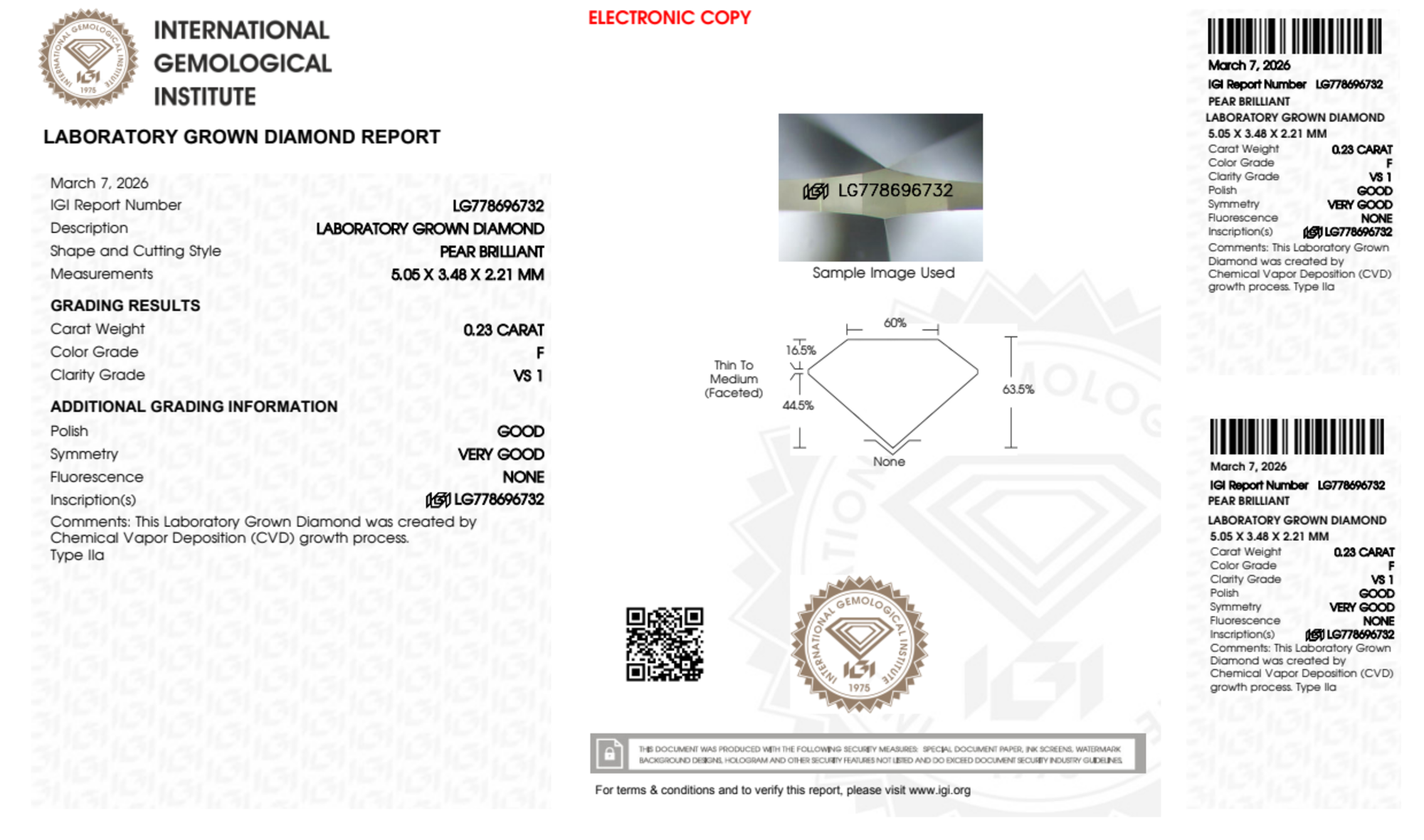 Your 0.23 carat Pear lab diamond is graded F color (Colorless), and you can read more about F color diamonds here.