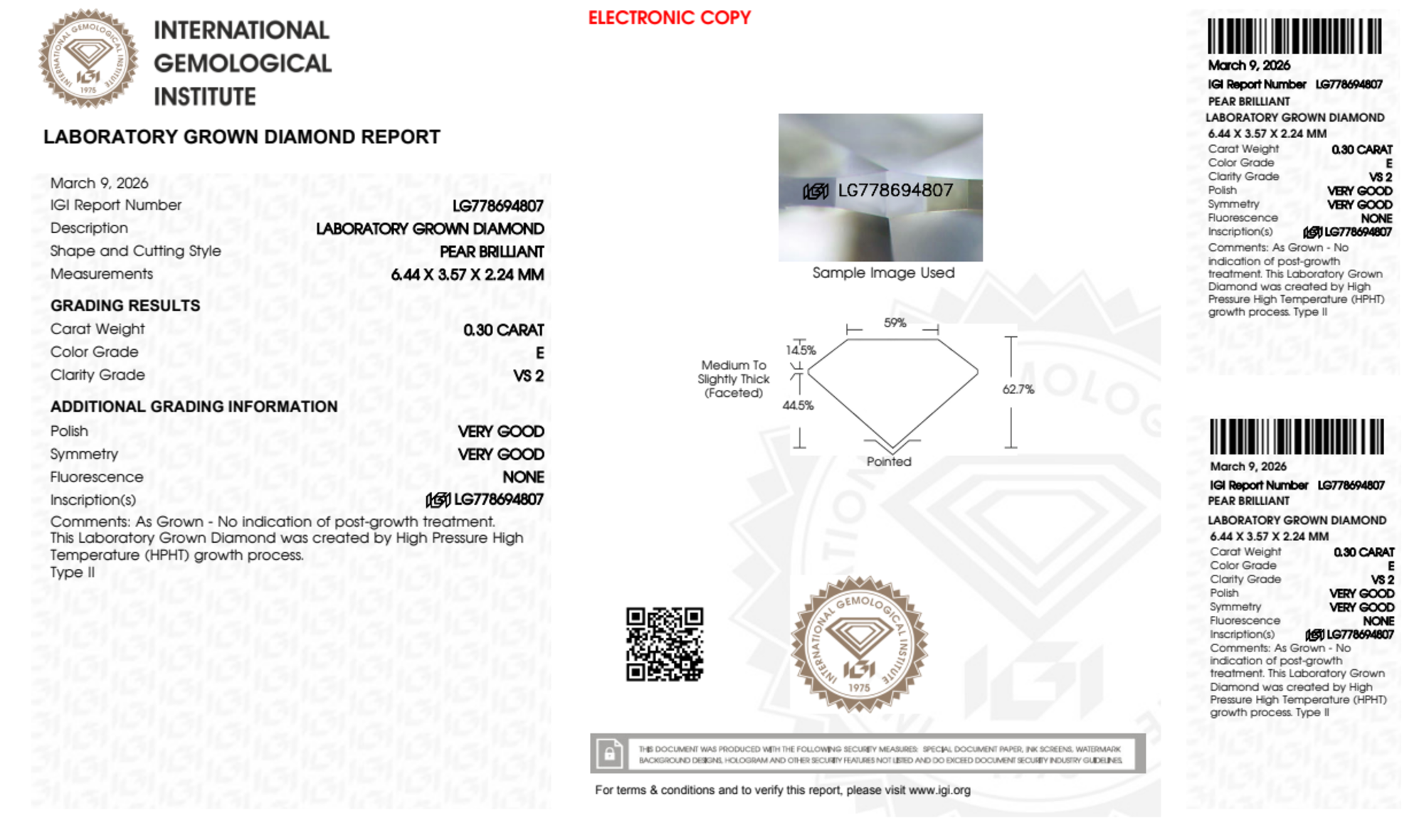 Your 0.30 carat Pear lab diamond is graded E color (Colorless), and you can read more about E color diamonds here.