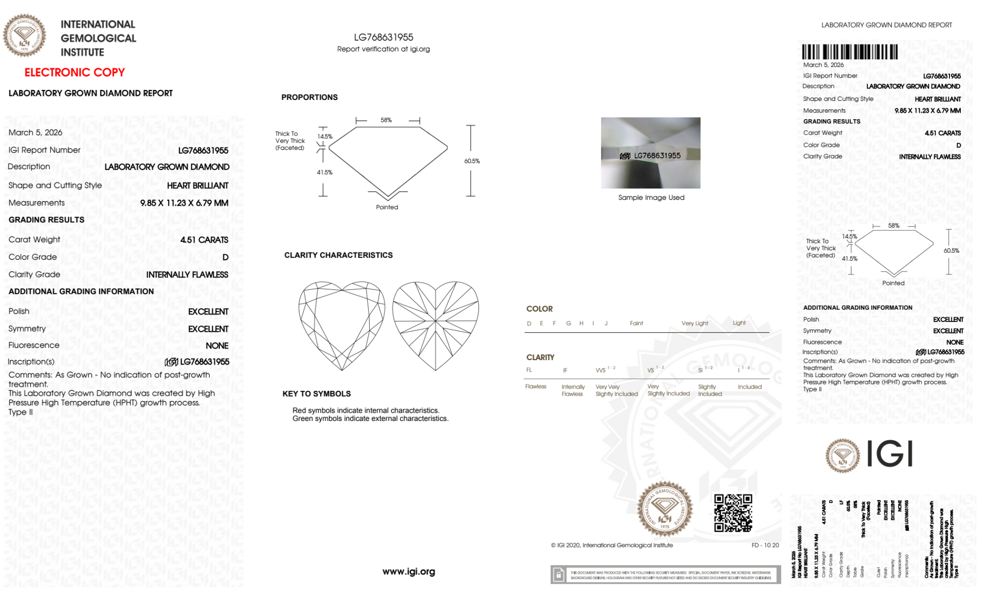 Your 4.51 carat Heart lab diamond is graded IF clarity, which stands for Internally Flawless. Read more about IF clarity diamonds here, or learn more about diamond clarity in general here.