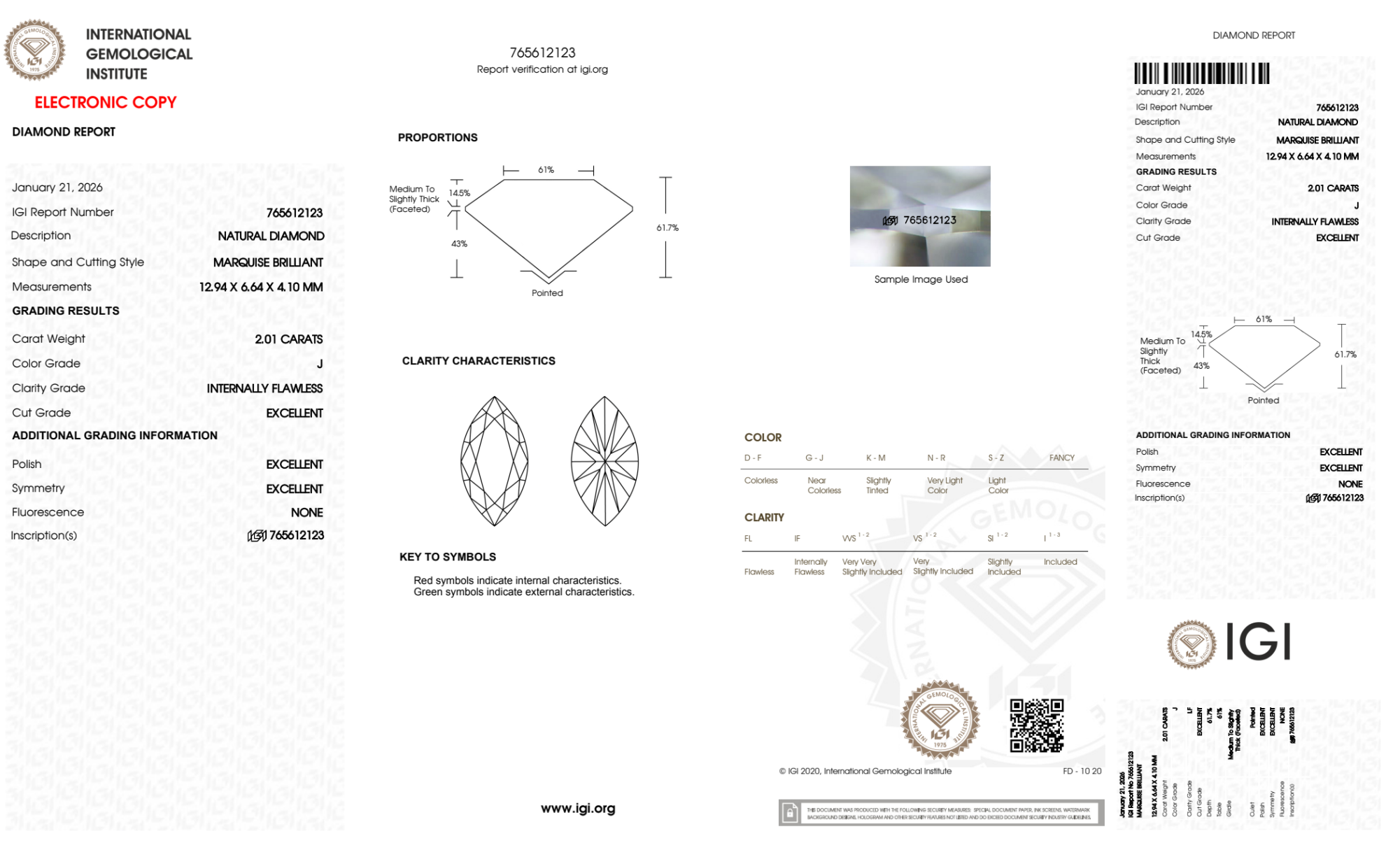 Your 2.01 carat Marquise natural diamond is graded IF clarity, which stands for Internally Flawless. Read more about IF clarity diamonds here, or learn more about diamond clarity in general here.