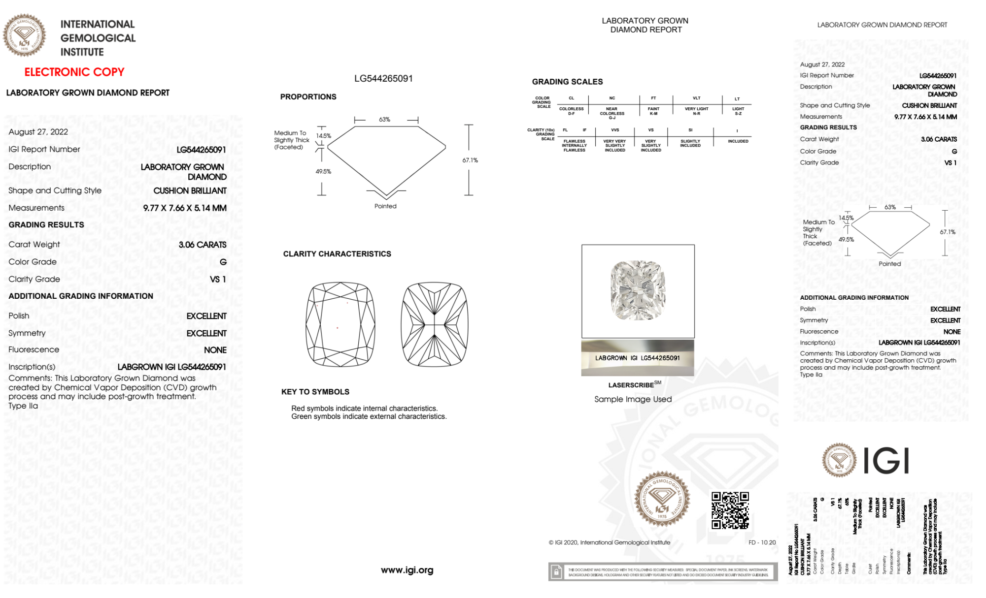 Your 3.06 carat Cushion lab diamond is graded G color (Near Colorless), and you can read more about G color diamonds here.