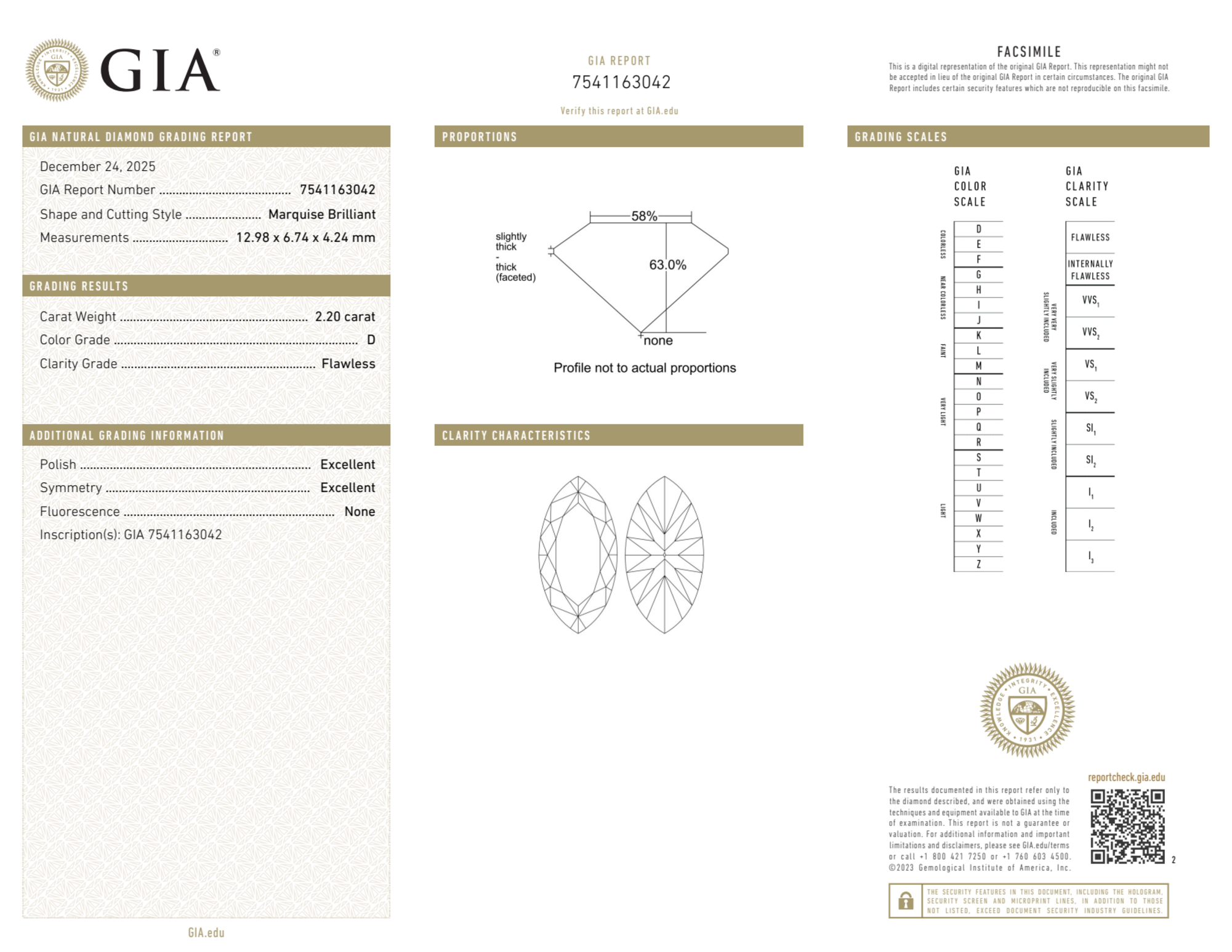 Your 2.20 carat Marquise natural diamond is graded FL clarity, which stands for Flawless. Read more about FL clarity diamonds here, or learn more about diamond clarity in general here.