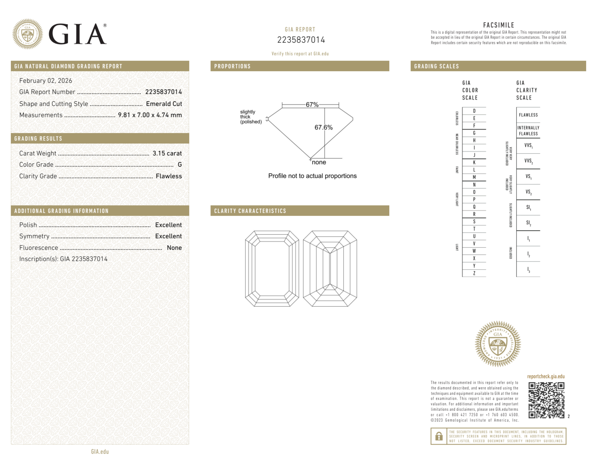 Your 3.15 carat Emerald natural diamond is graded FL clarity, which stands for Flawless. Read more about FL clarity diamonds here, or learn more about diamond clarity in general here.