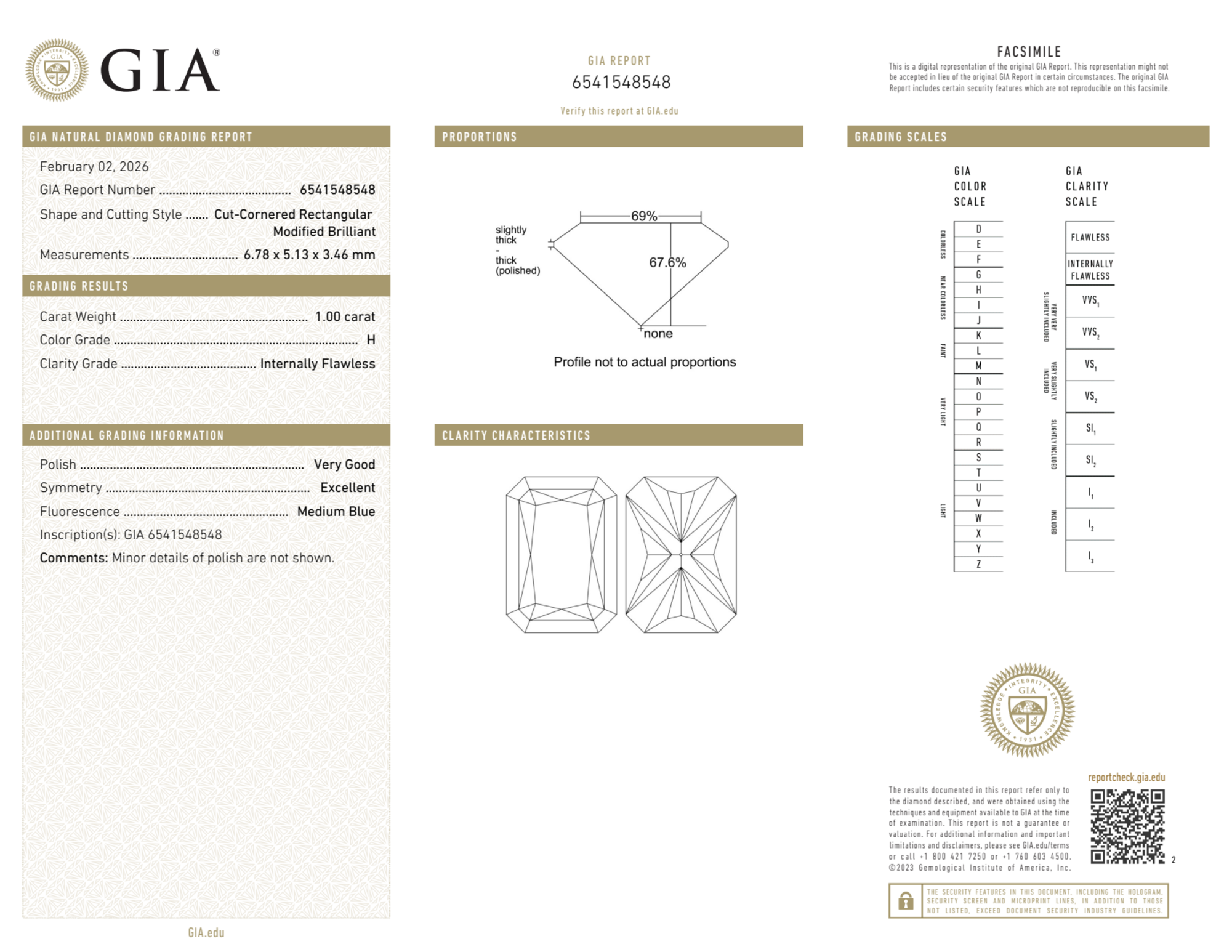 Your 1.00 carat Radiant natural diamond is graded IF clarity, which stands for Internally Flawless. Read more about IF clarity diamonds here, or learn more about diamond clarity in general here.