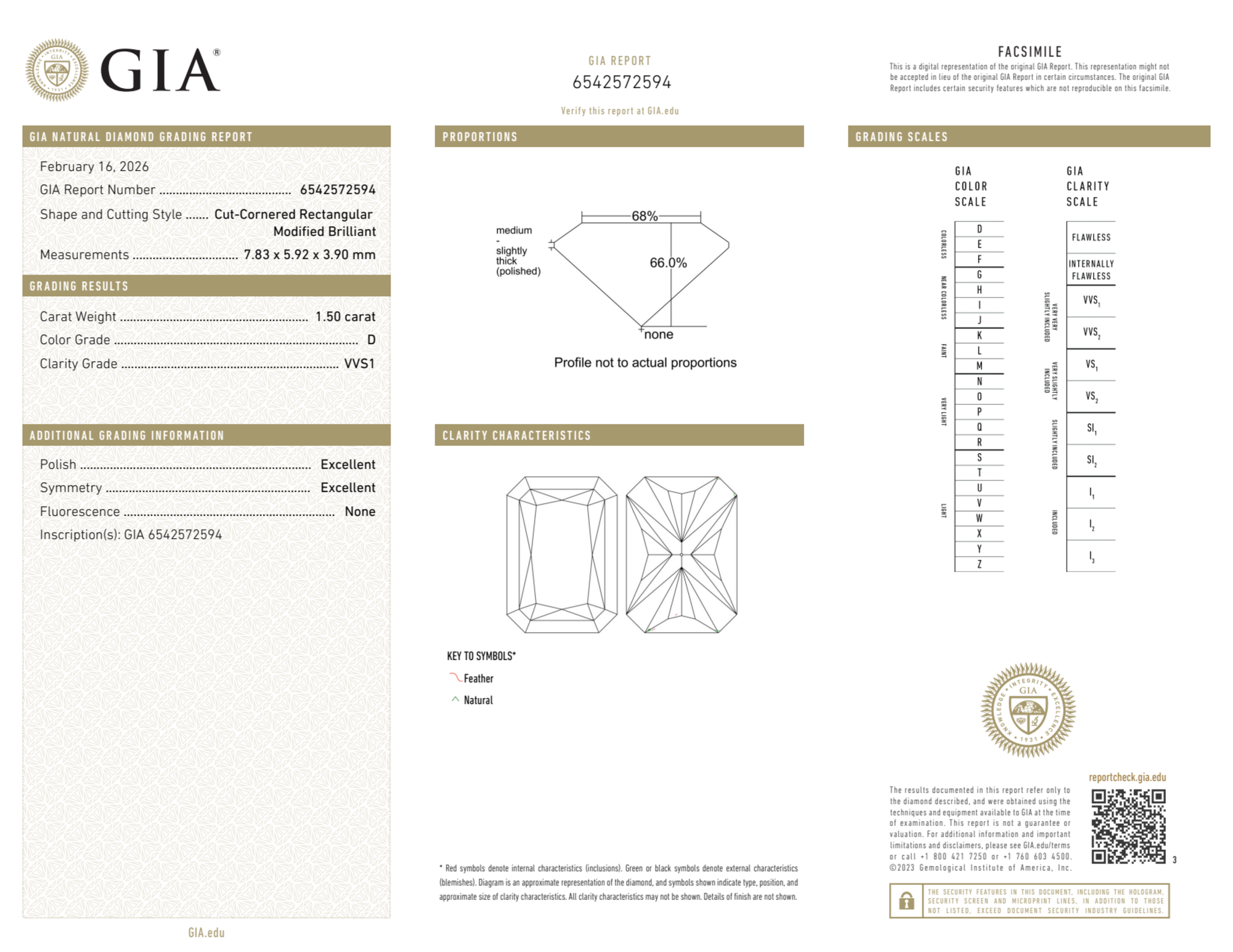 Your 1.50 carat Radiant natural diamond is graded VVS1 clarity, which stands for Very Very Slightly Included 1. Read more about VVS1 clarity diamonds here, or learn more about diamond clarity in general here.