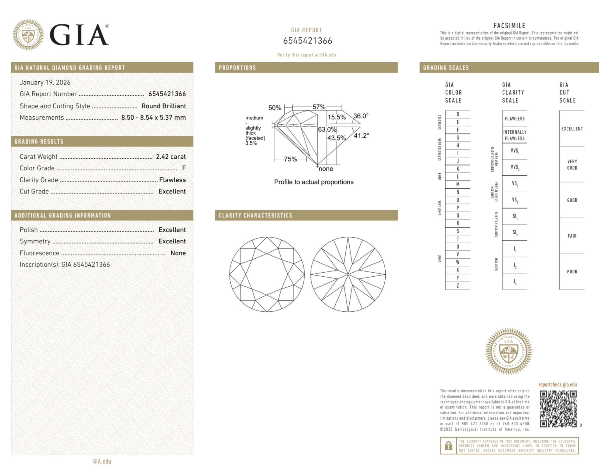Your 2.42 carat Round natural diamond is graded FL clarity, which stands for Flawless. Read more about FL clarity diamonds here, or learn more about diamond clarity in general here.