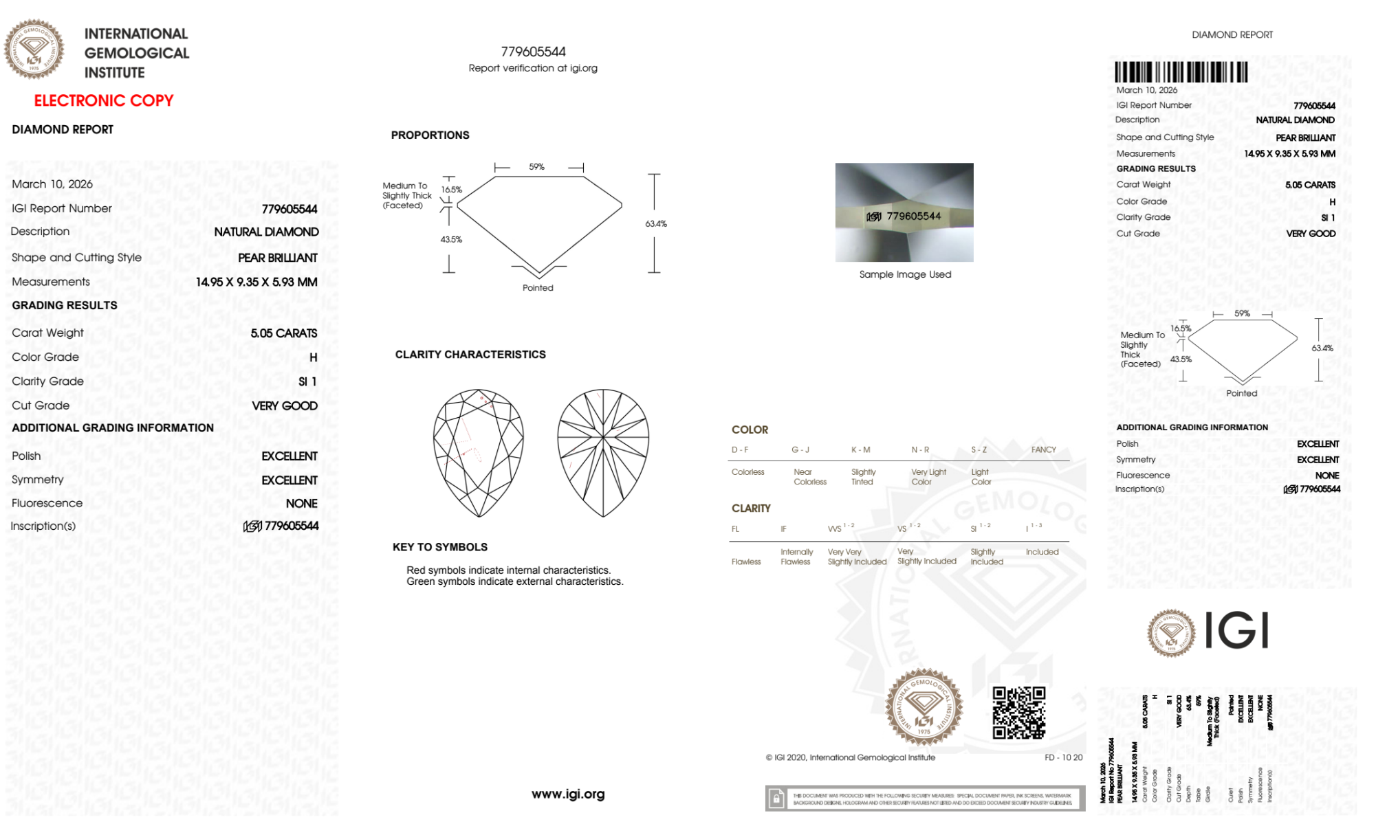 Your 5.05 carat Pear natural diamond is graded SI1 clarity, which stands for Slightly Included 1. Read more about SI1 clarity diamonds here, or learn more about diamond clarity in general here.