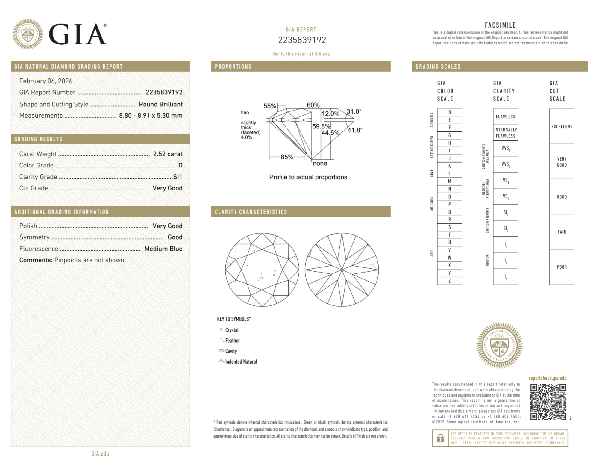 Your 2.52 carat Round natural diamond is graded D color (Colorless), and you can read more about D color diamonds here.
