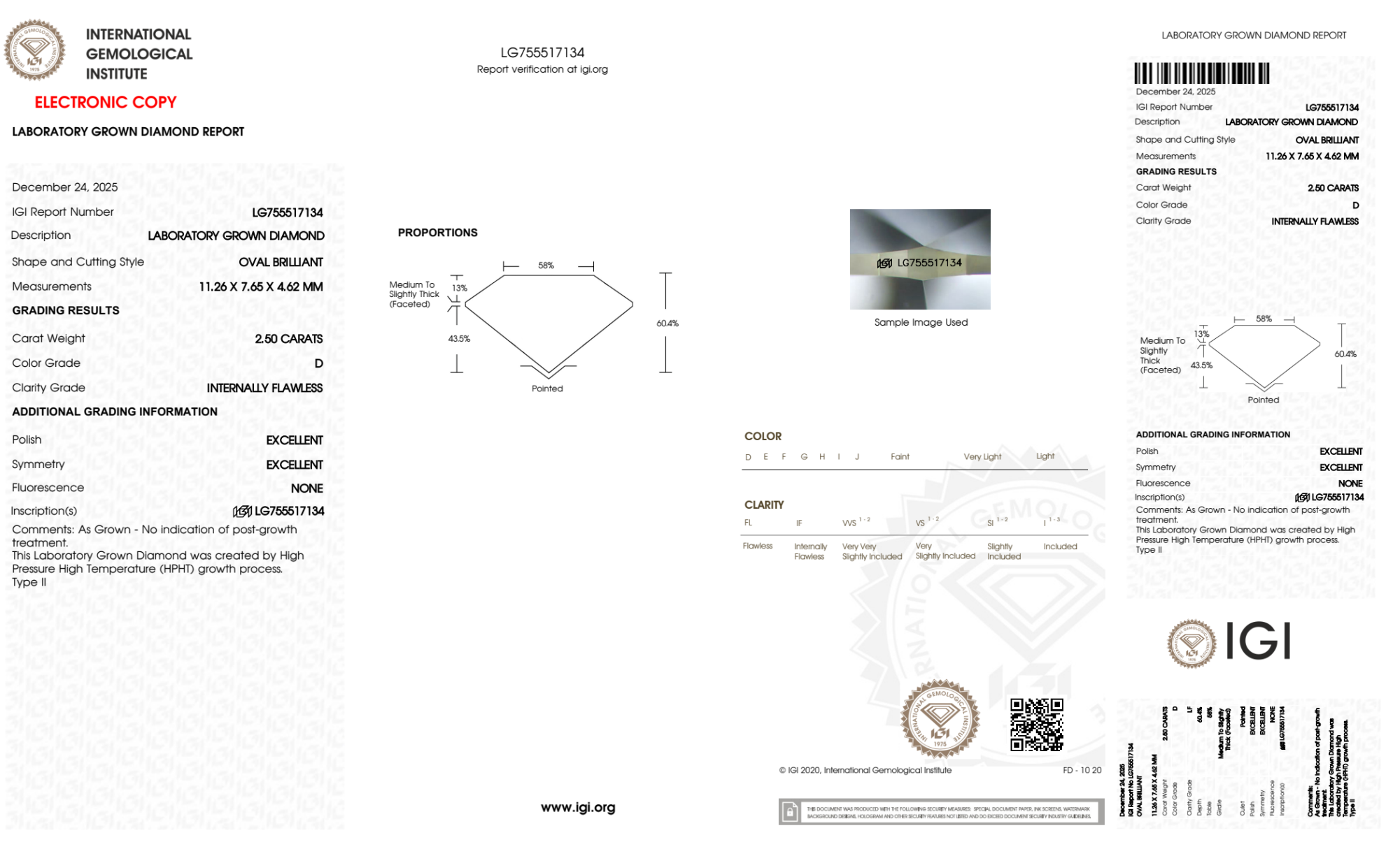 Your 2.50 carat Oval lab diamond is graded IF clarity, which stands for Internally Flawless. Read more about IF clarity diamonds here, or learn more about diamond clarity in general here.
