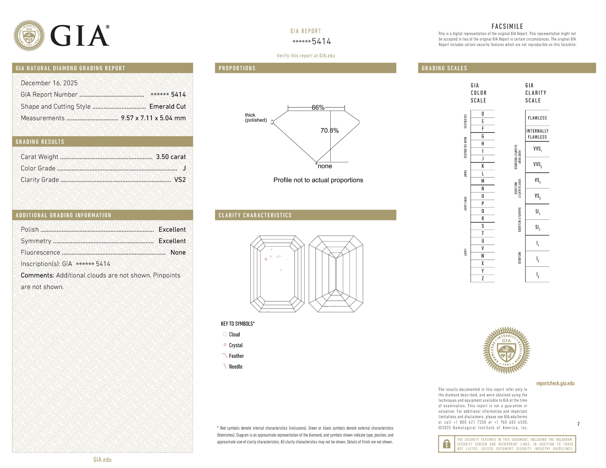 Your 3.50 carat Emerald natural diamond is graded VS2 clarity, which stands for Very Slightly Included 2. Read more about VS2 clarity diamonds here, or learn more about diamond clarity in general here.