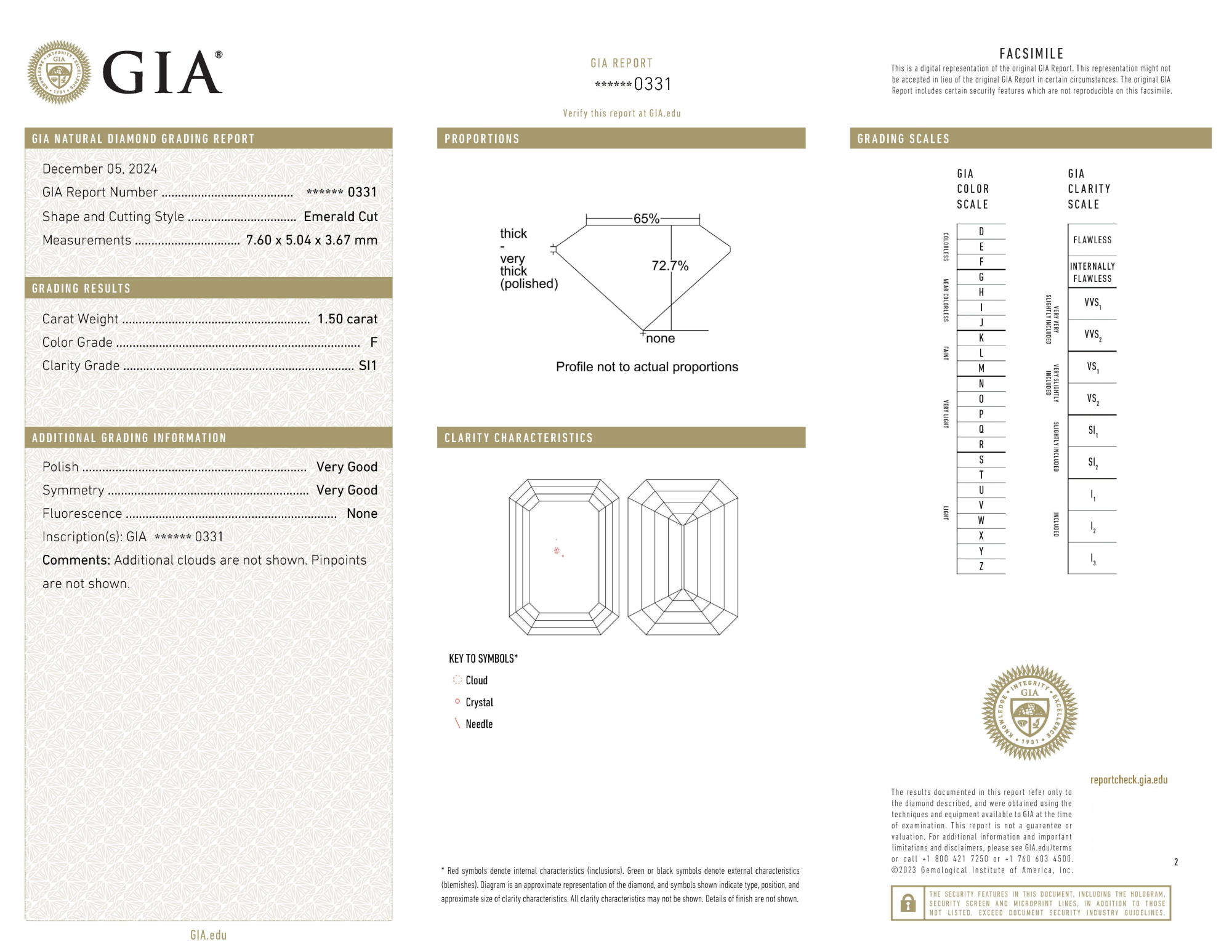 Your 1.50 carat Emerald natural diamond is graded SI1 clarity, which stands for Slightly Included 1. Read more about SI1 clarity diamonds here, or learn more about diamond clarity in general here.