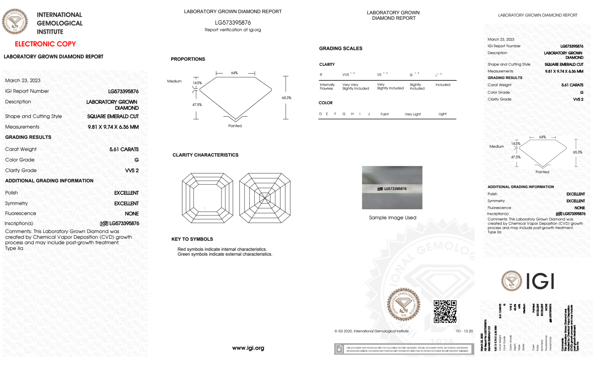 Your 5.61 carat Asscher lab diamond is graded G color (Near Colorless), and you can read more about G color diamonds here.