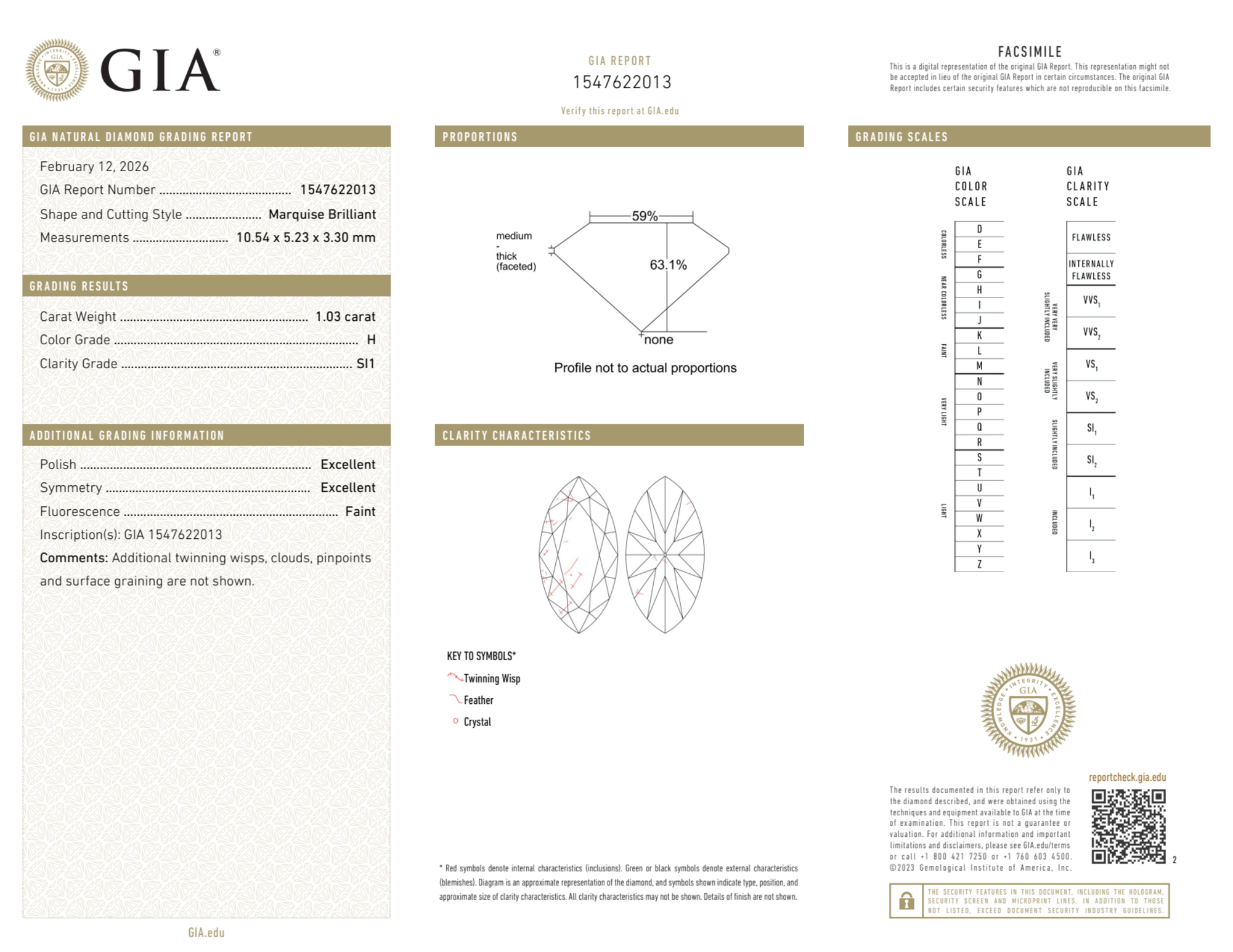 Your 1.03 carat Marquise natural diamond is graded SI1 clarity, which stands for Slightly Included 1. Read more about SI1 clarity diamonds here, or learn more about diamond clarity in general here.