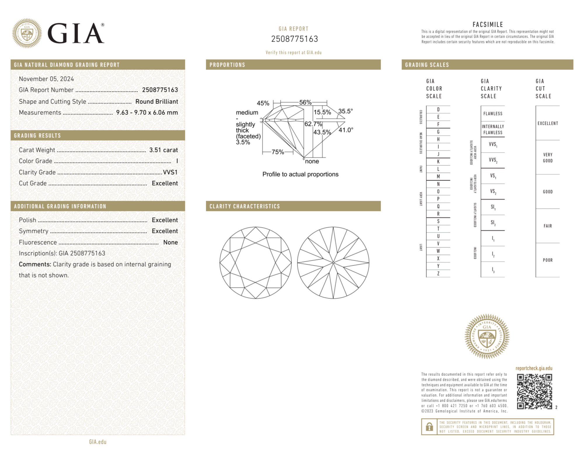 Your 3.51 carat Round natural diamond is graded VVS1 clarity, which stands for Very Very Slightly Included 1. Read more about VVS1 clarity diamonds here, or learn more about diamond clarity in general here.