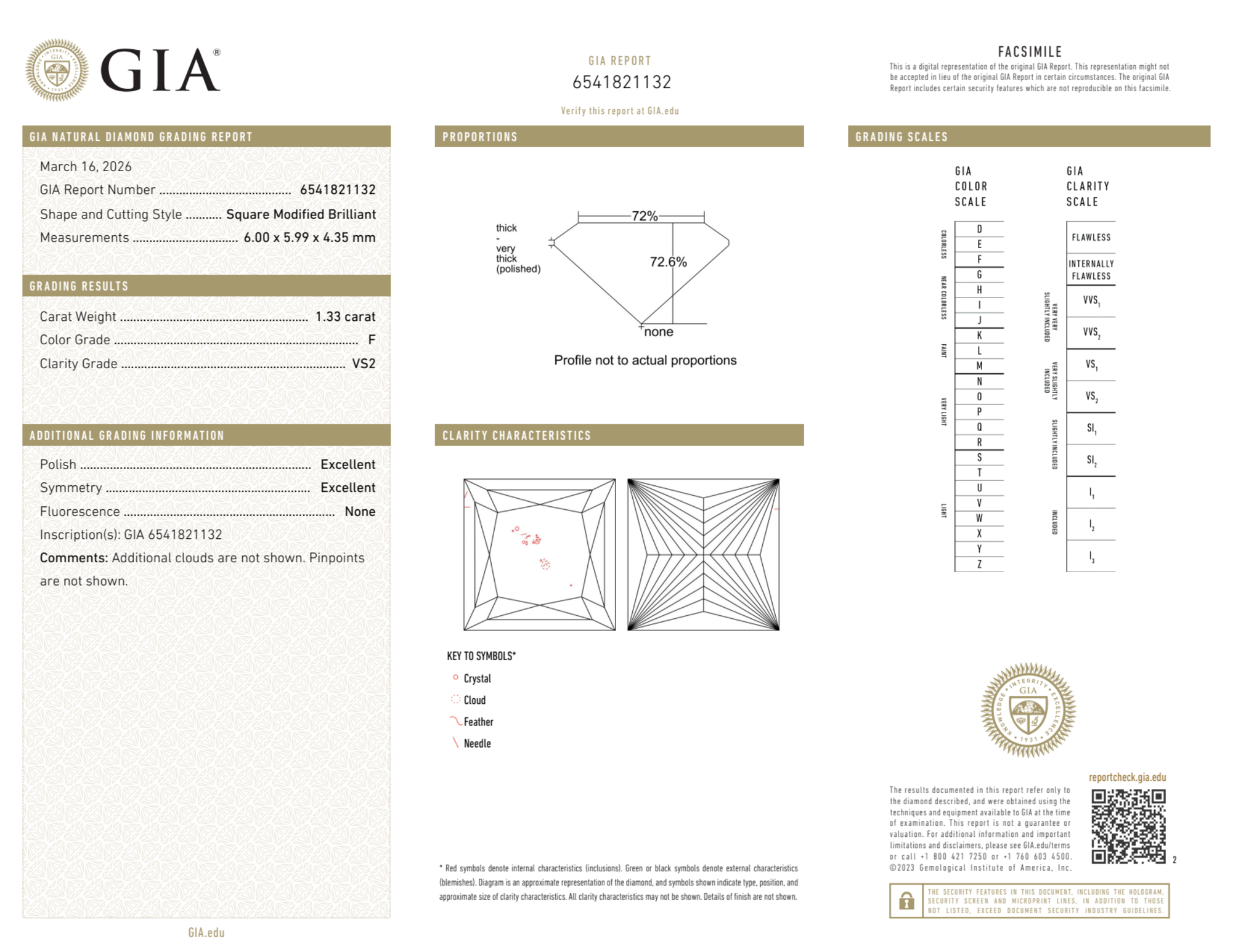 Your 1.33 carat Princess natural diamond is graded VS2 clarity, which stands for Very Slightly Included 2. Read more about VS2 clarity diamonds here, or learn more about diamond clarity in general here.