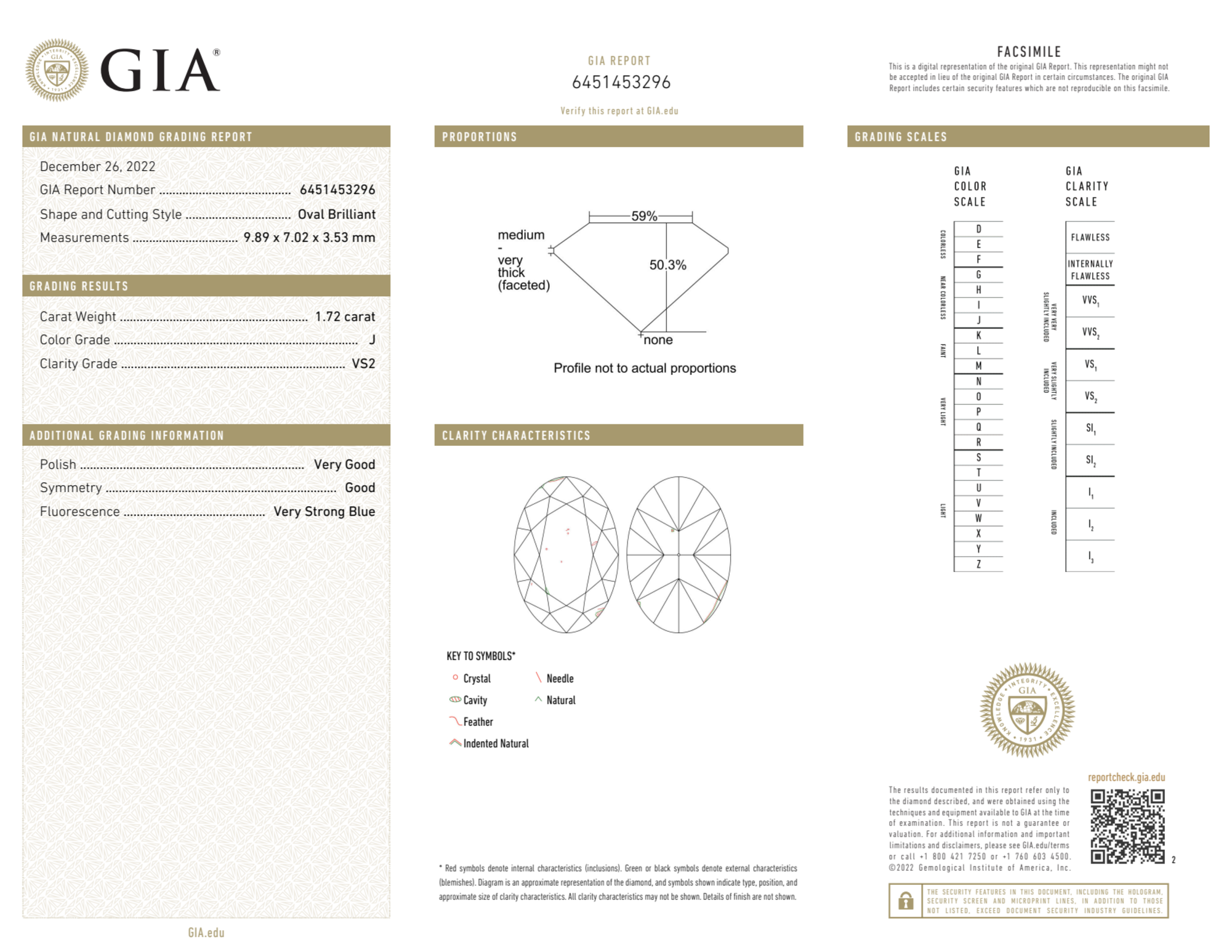 Your 1.72 carat Oval natural diamond is graded VS2 clarity, which stands for Very Slightly Included 2. Read more about VS2 clarity diamonds here, or learn more about diamond clarity in general here.