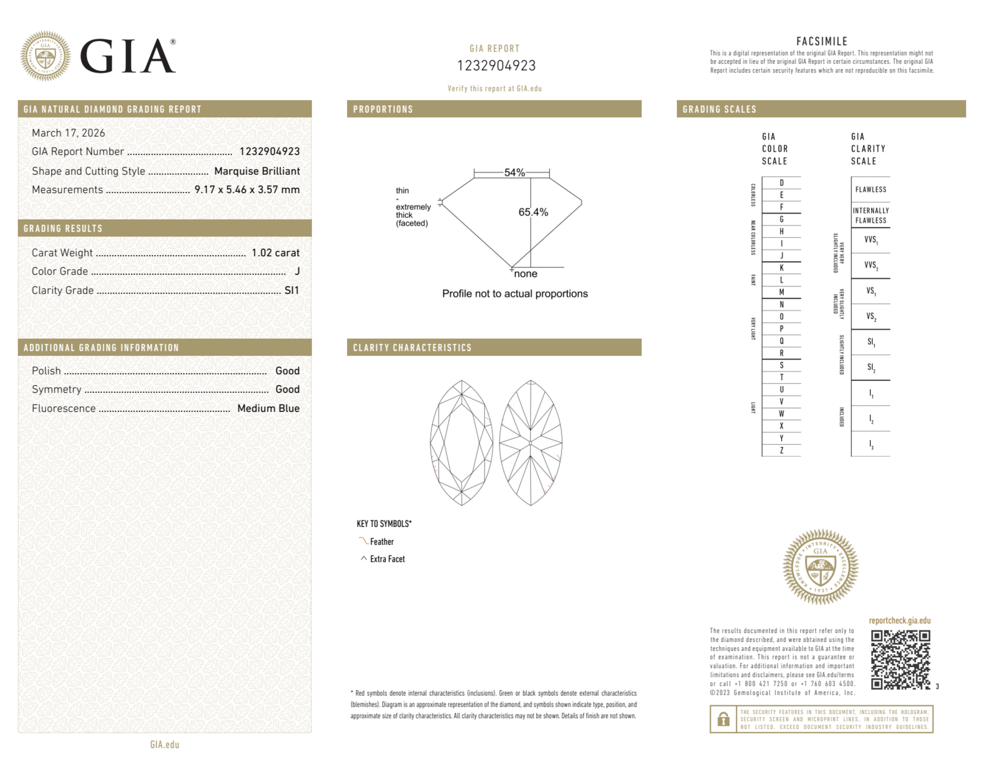 Your 1.02 carat Marquise natural diamond is graded SI1 clarity, which stands for Slightly Included 1. Read more about SI1 clarity diamonds here, or learn more about diamond clarity in general here.