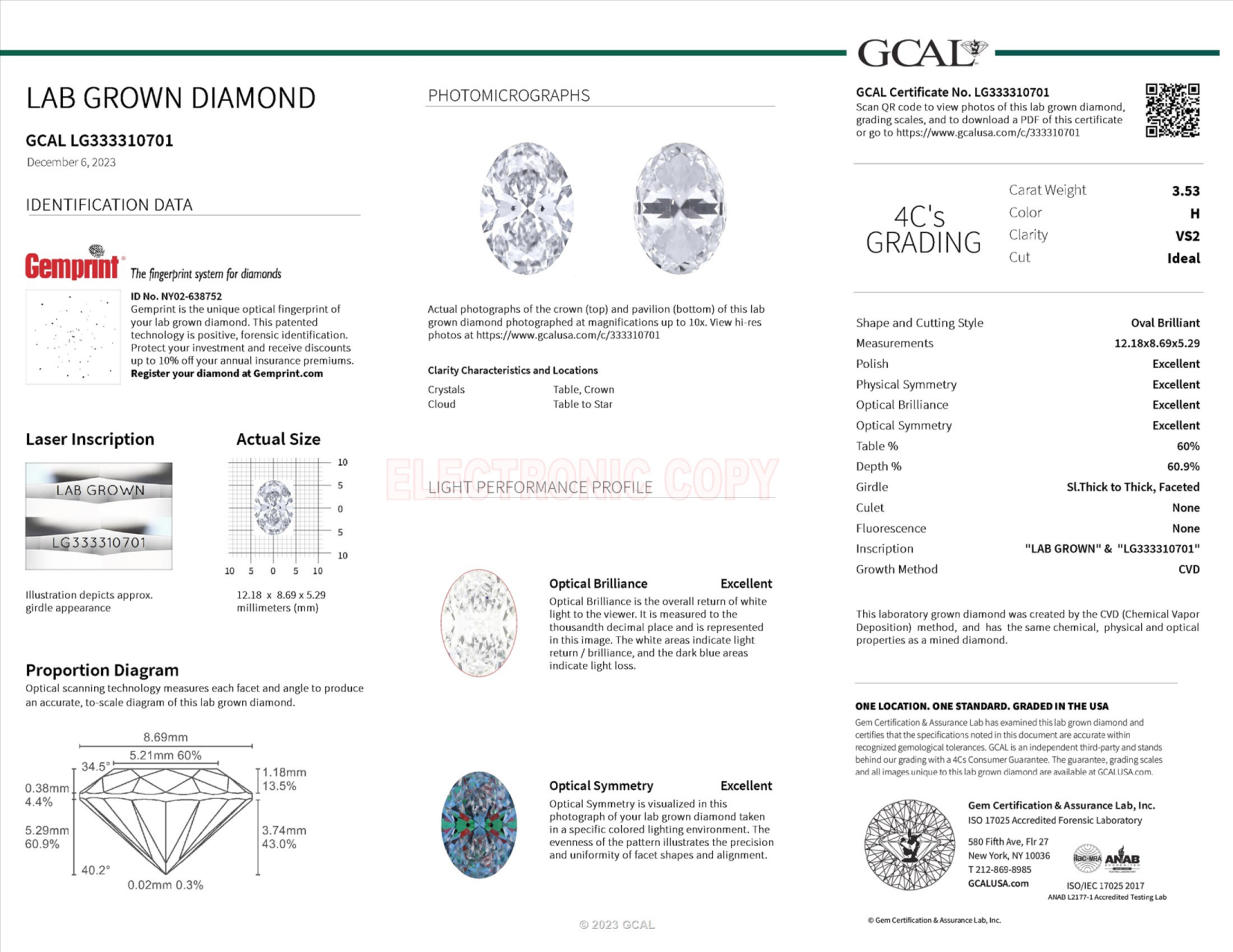 Your 3.53 carat Oval lab diamond is graded H color (Near Colorless), and you can read more about H color diamonds here.