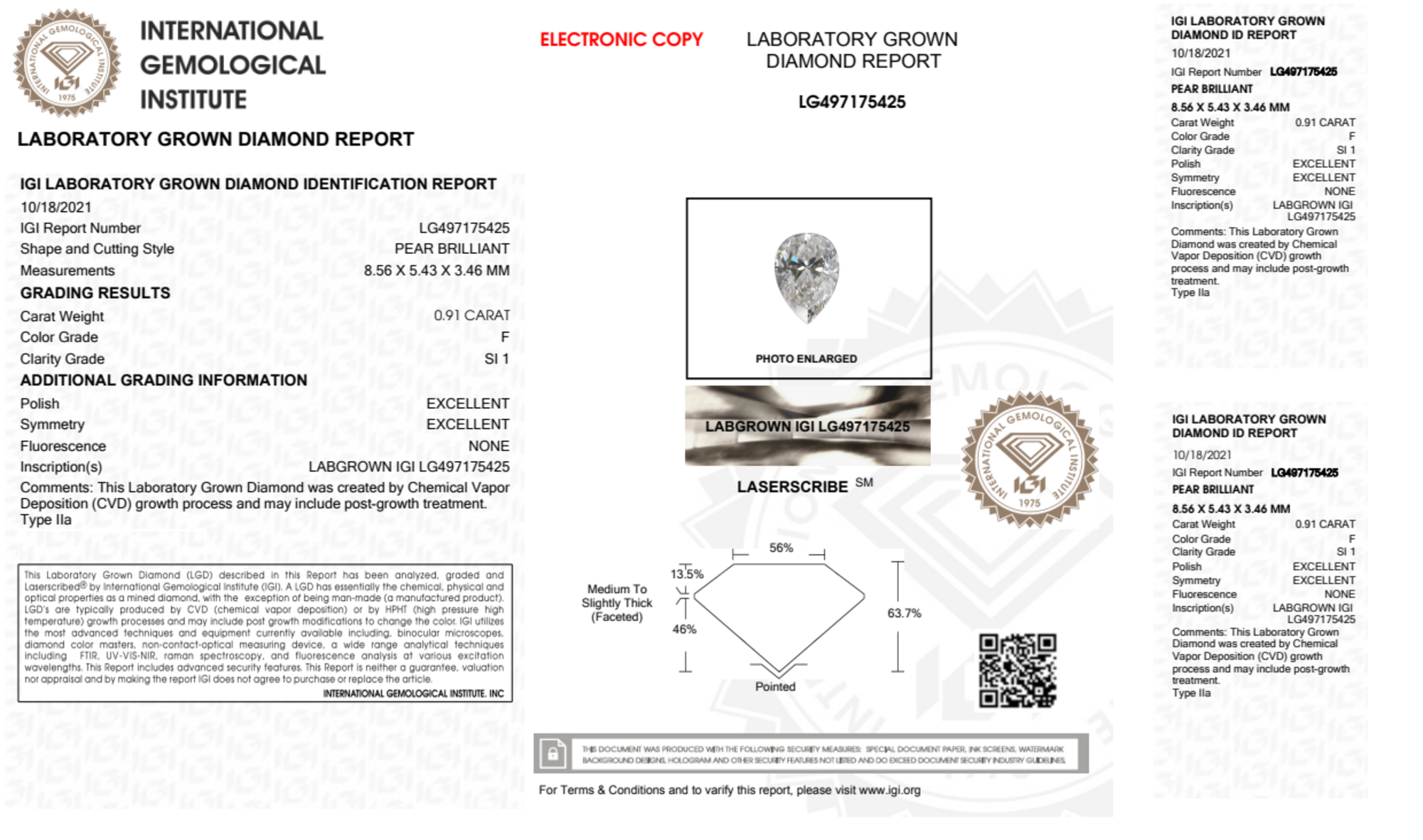 Your 0.91 carat Pear lab diamond is graded F color (Colorless), and you can read more about F color diamonds here.