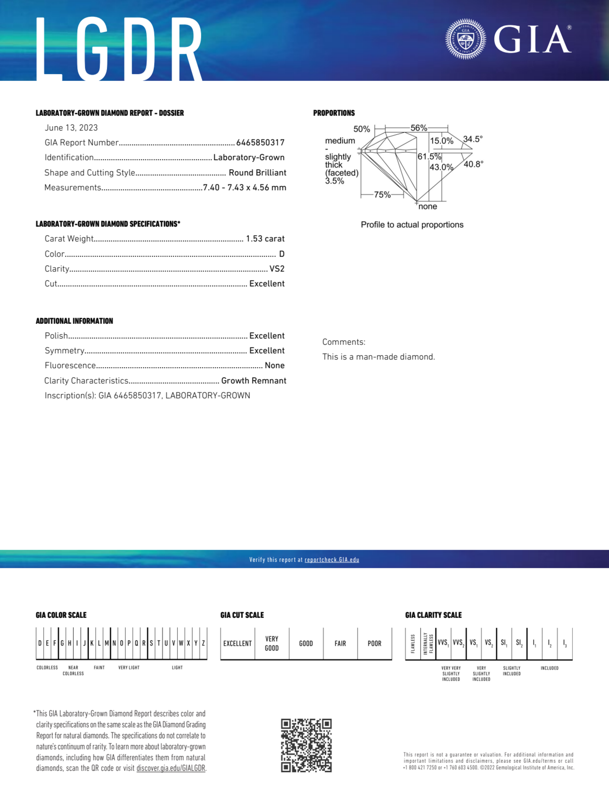 Your 1.53 carat Round lab diamond is graded D color (Colorless), and you can read more about D color diamonds here.
