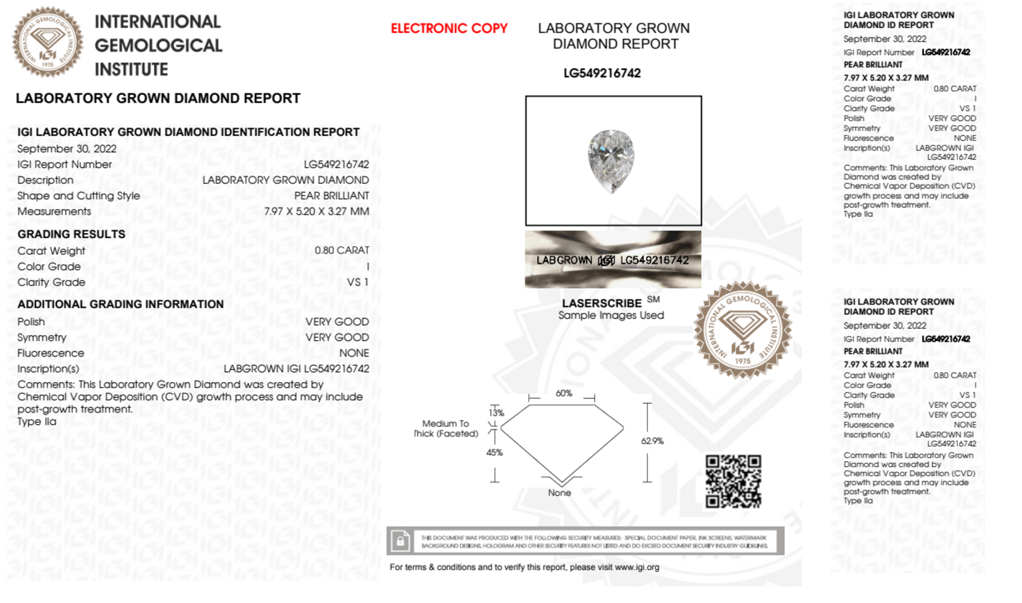 Your 0.80 carat Pear lab diamond is graded I color (Near Colorless), and you can read more about I color diamonds here.