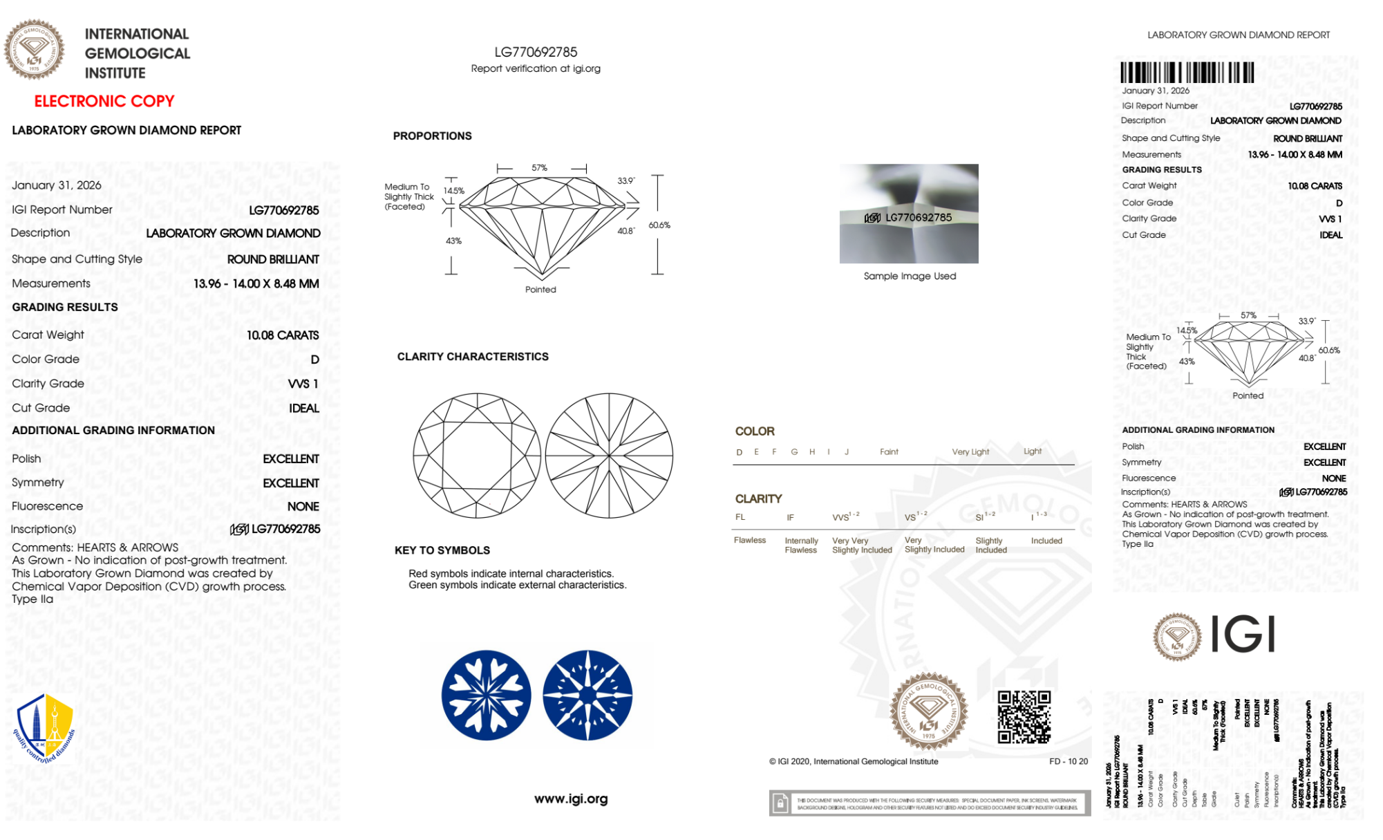 Your 10.08 carat Round lab diamond is graded VVS1 clarity, which stands for Very Very Slightly Included 1. Read more about VVS1 clarity diamonds here, or learn more about diamond clarity in general here.