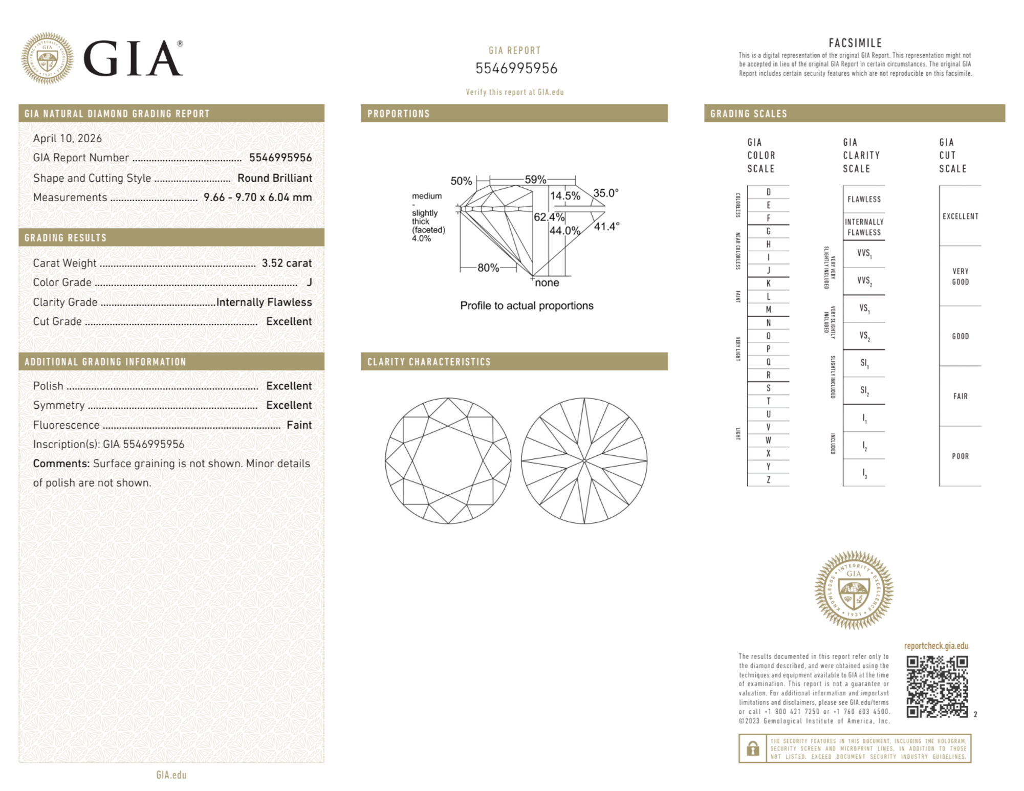 Your 3.52 carat Round natural diamond is graded IF clarity, which stands for Internally Flawless. Read more about IF clarity diamonds here, or learn more about diamond clarity in general here.