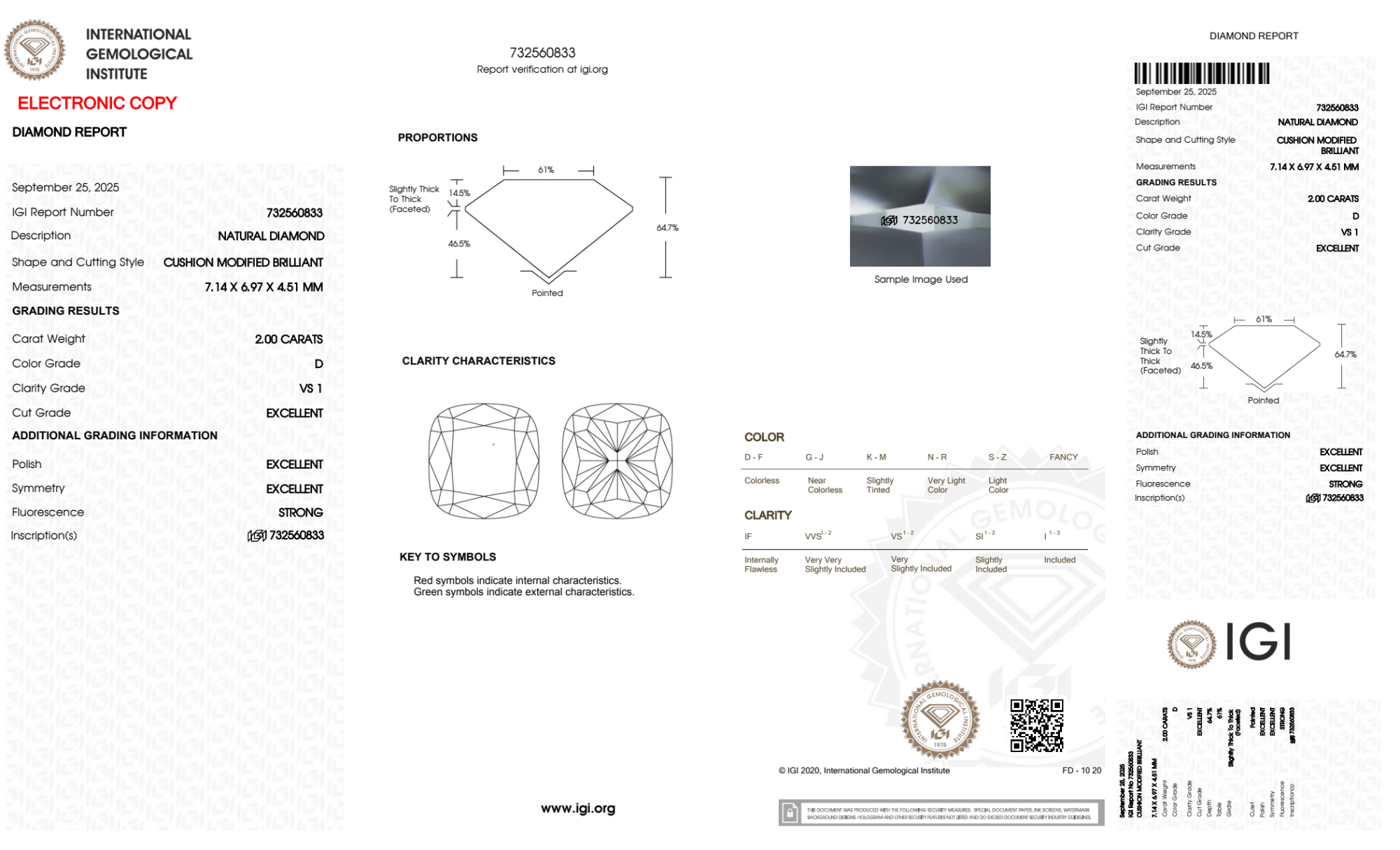 Your 2.00 carat Cushion natural diamond is graded D color (Colorless), and you can read more about D color diamonds here.