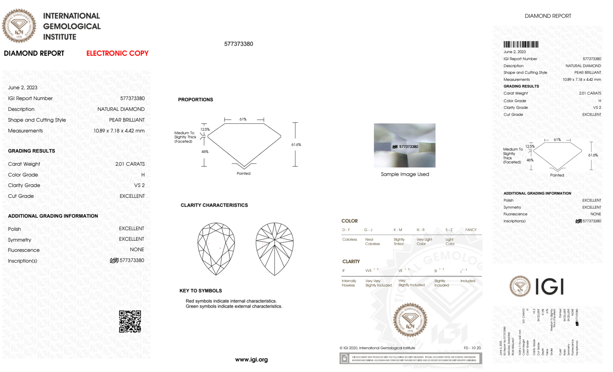 Your 2.01 carat Pear natural diamond is graded VS2 clarity, which stands for Very Slightly Included 2. Read more about VS2 clarity diamonds here, or learn more about diamond clarity in general here.