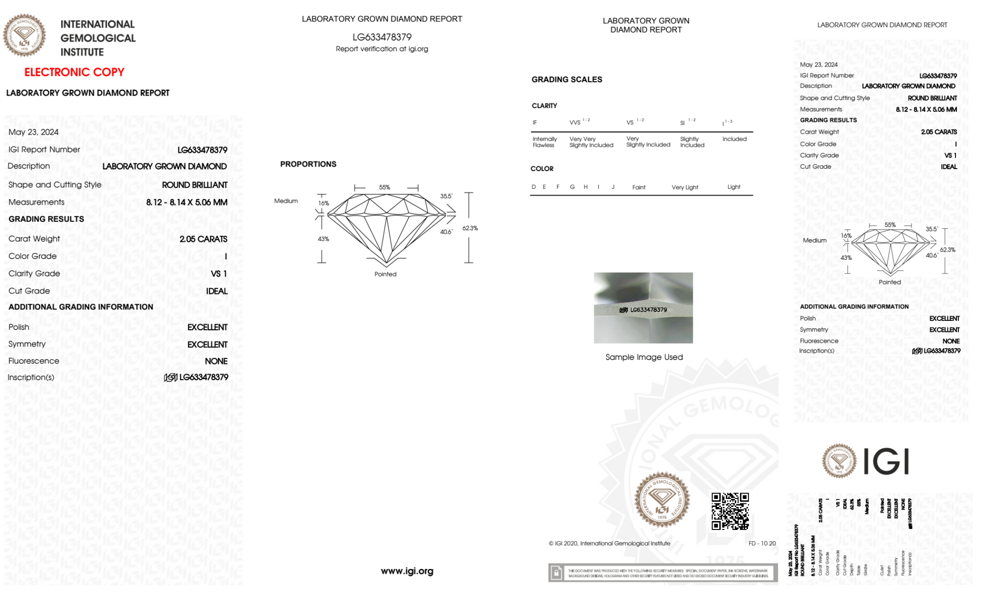 Your 2.05 carat Round lab diamond is graded I color (Near Colorless), and you can read more about I color diamonds here.