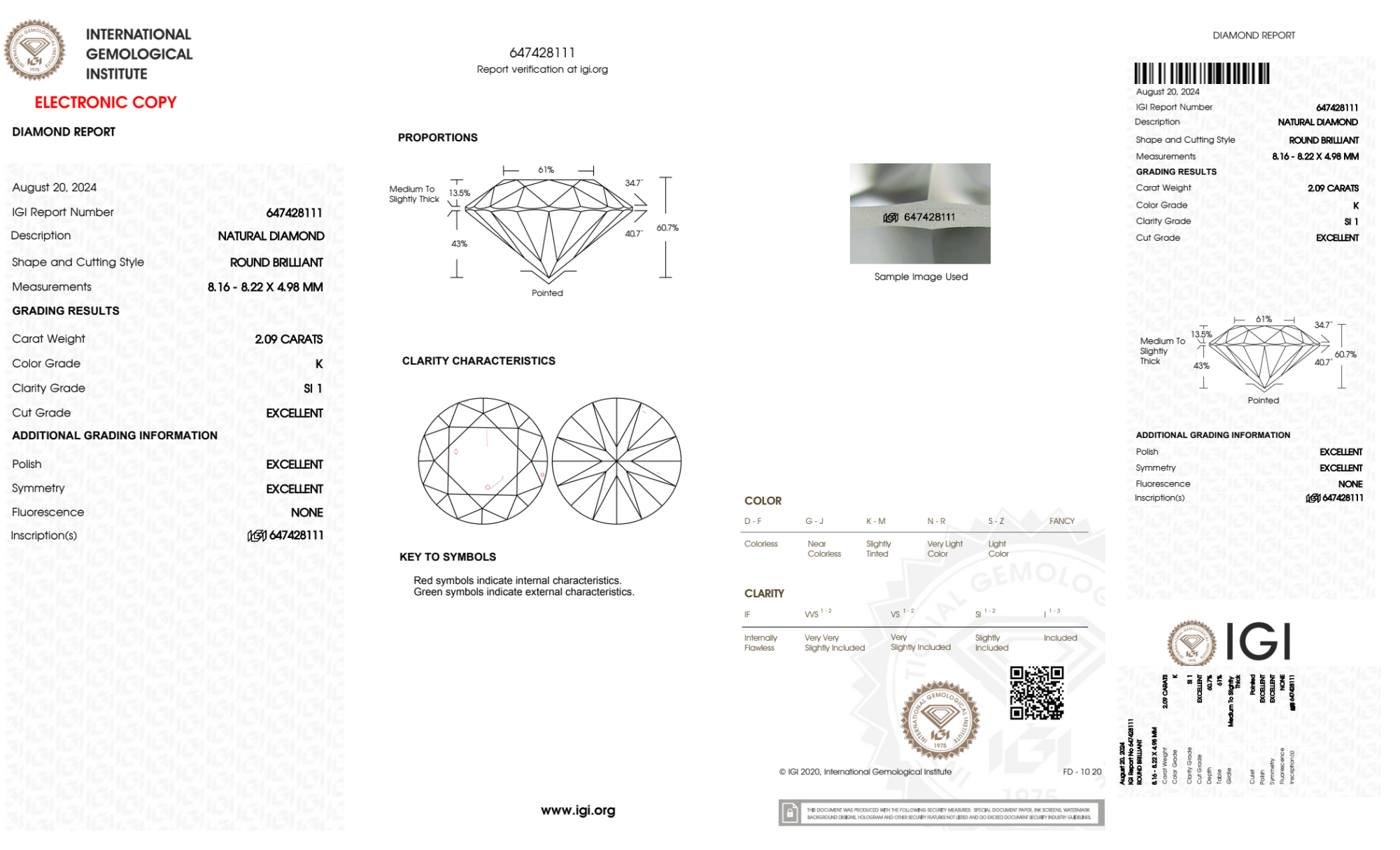 Your 2.09 carat Round natural diamond is graded K color (Faint Color), and you can read more about K color diamonds here.