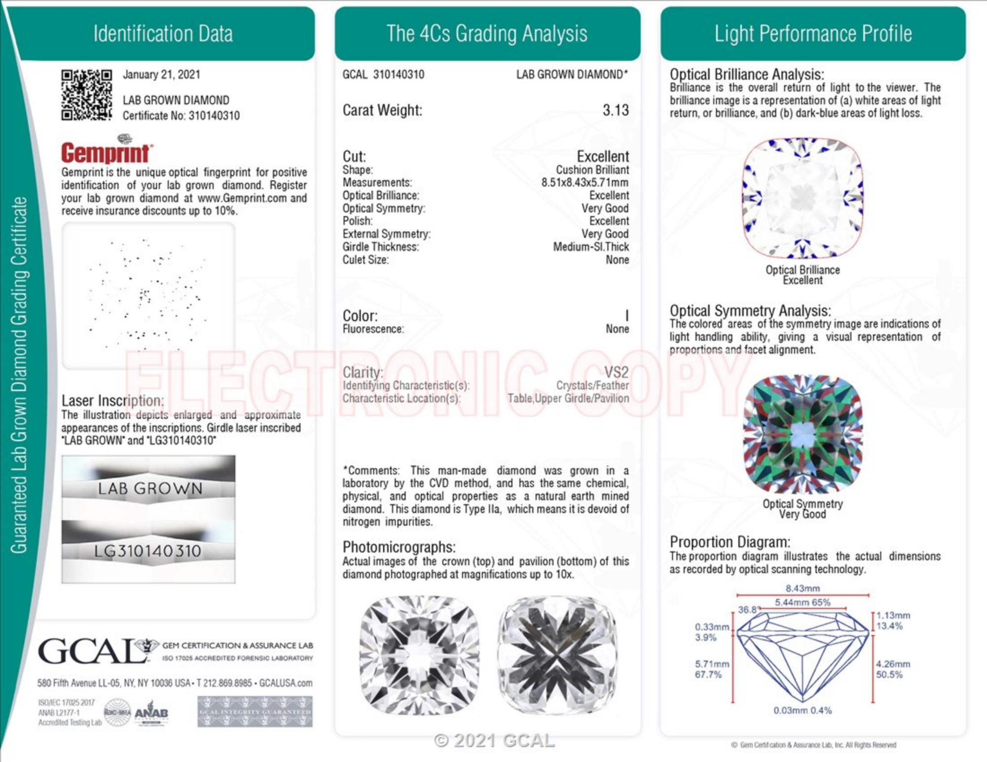 Your 3.13 carat Cushion lab diamond is graded I color (Near Colorless), and you can read more about I color diamonds here.