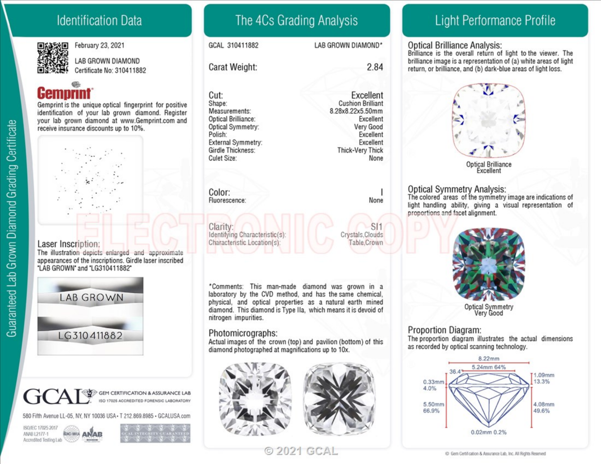 Your 2.84 carat Cushion lab diamond is graded I color (Near Colorless), and you can read more about I color diamonds here.