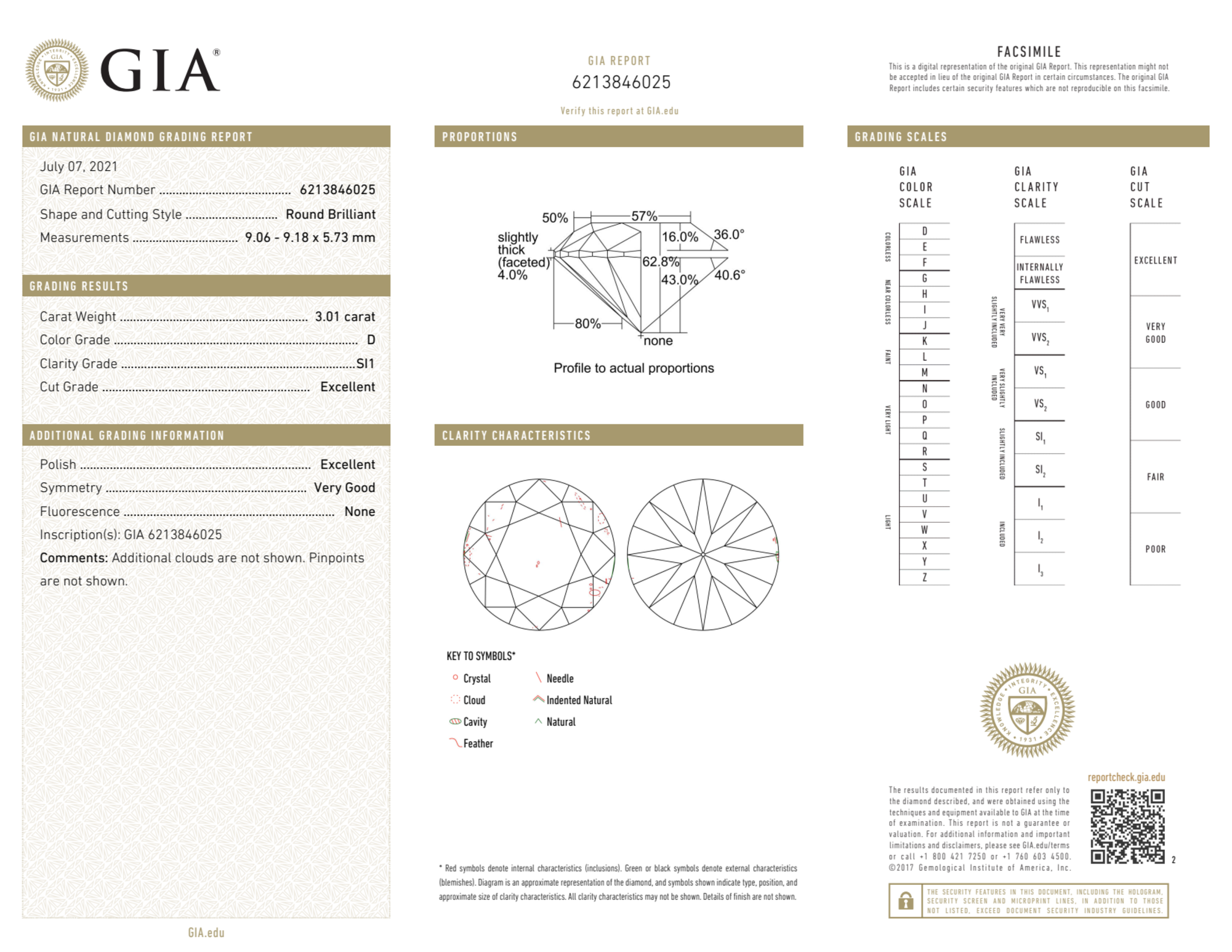 Your 3.01 carat Round natural diamond is graded SI1 clarity, which stands for Slightly Included 1. Read more about SI1 clarity diamonds here, or learn more about diamond clarity in general here.