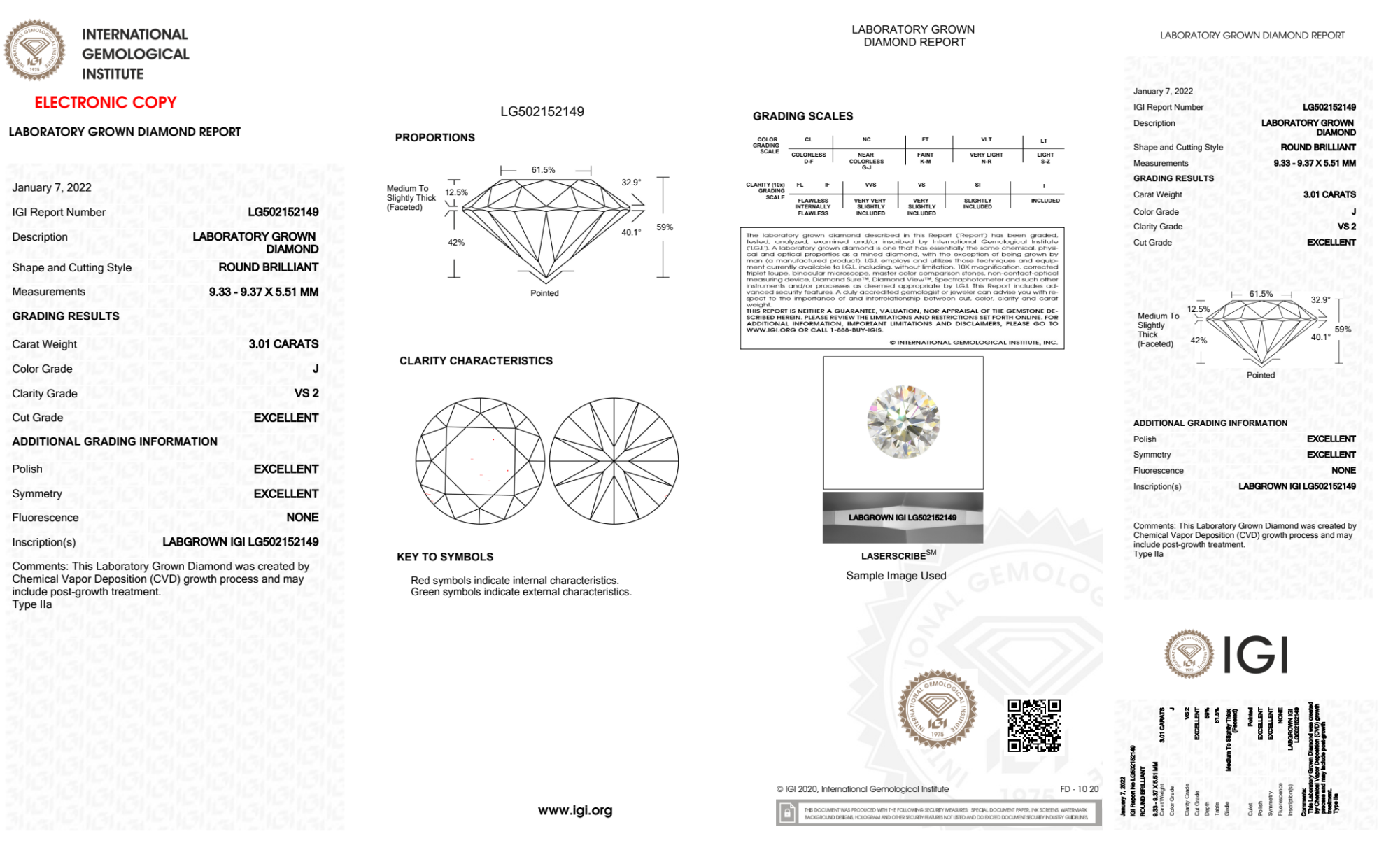 Your 3.01 carat Round lab diamond is graded J color (Near Colorless), and you can read more about J color diamonds here.