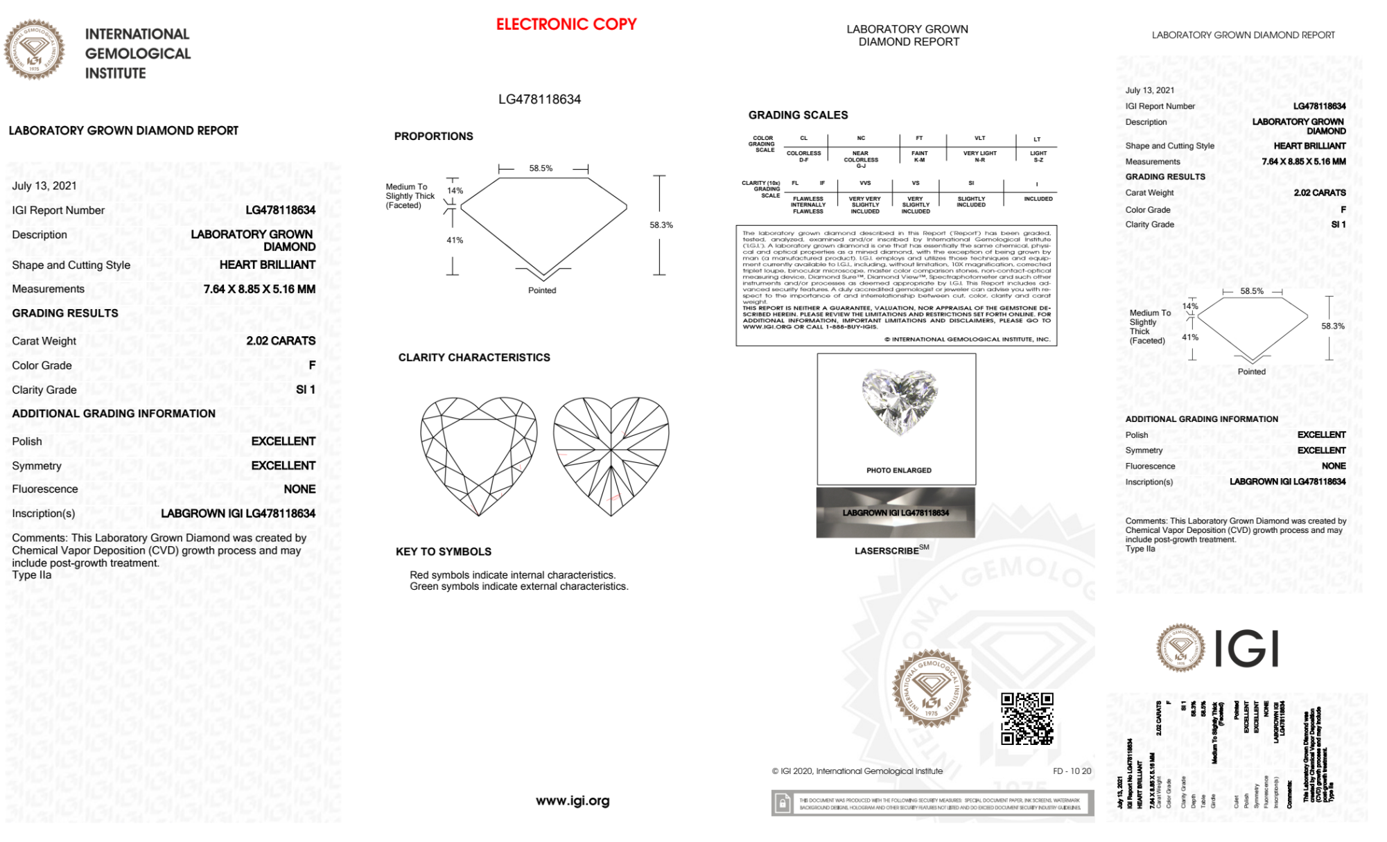 Your 2.02 carat Heart lab diamond is graded F color (Colorless), and you can read more about F color diamonds here.