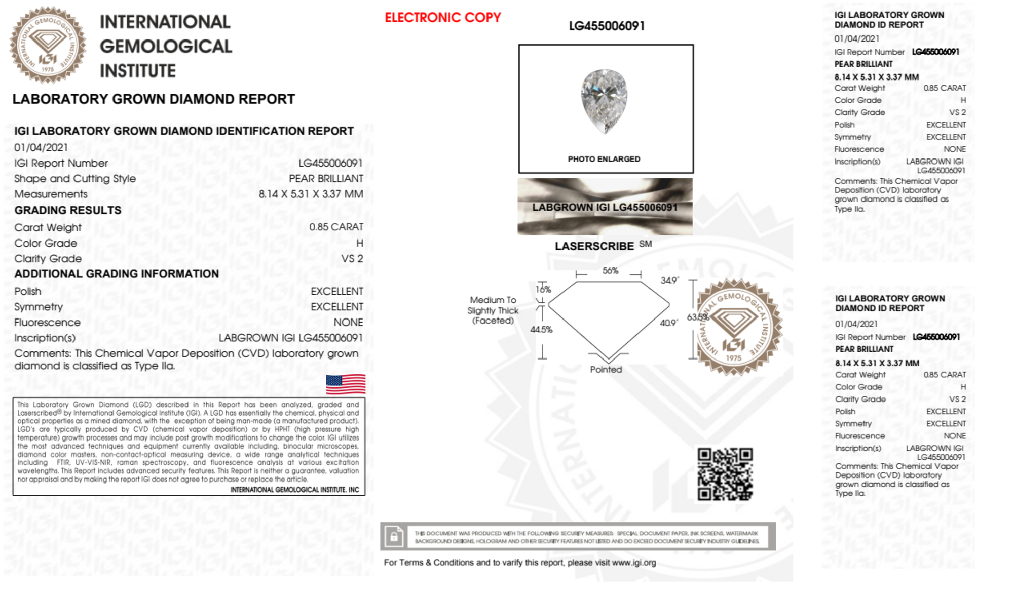 Your 0.85 carat Pear lab diamond is graded H color (Near Colorless), and you can read more about H color diamonds here.