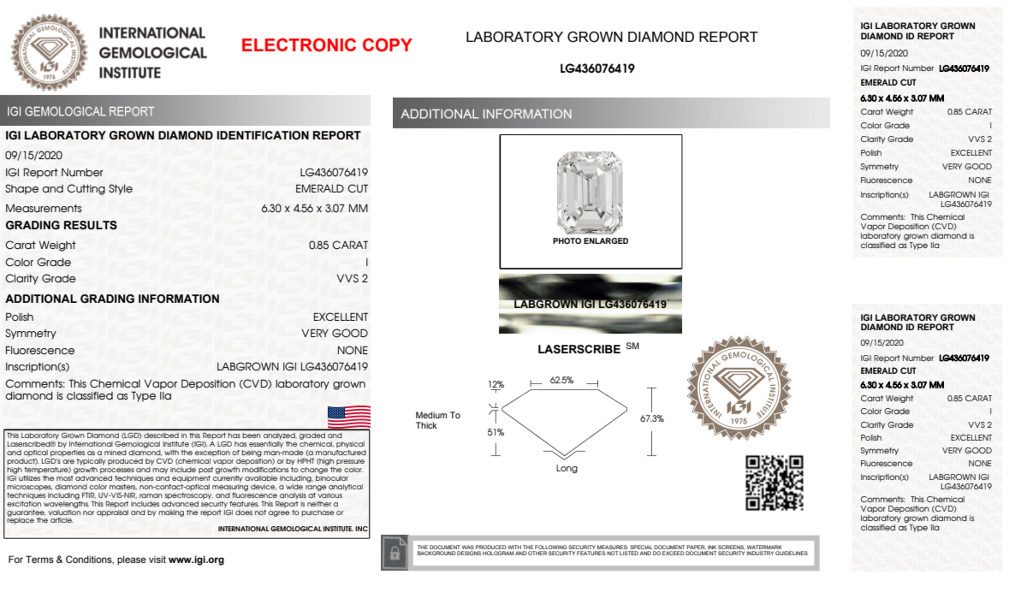 Your 0.85 carat Emerald lab diamond is graded I color (Near Colorless), and you can read more about I color diamonds here.