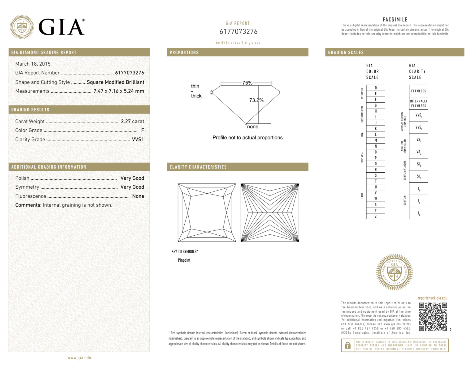 Your 2.27 carat Princess natural diamond is graded F color (Colorless), and you can read more about F color diamonds here.