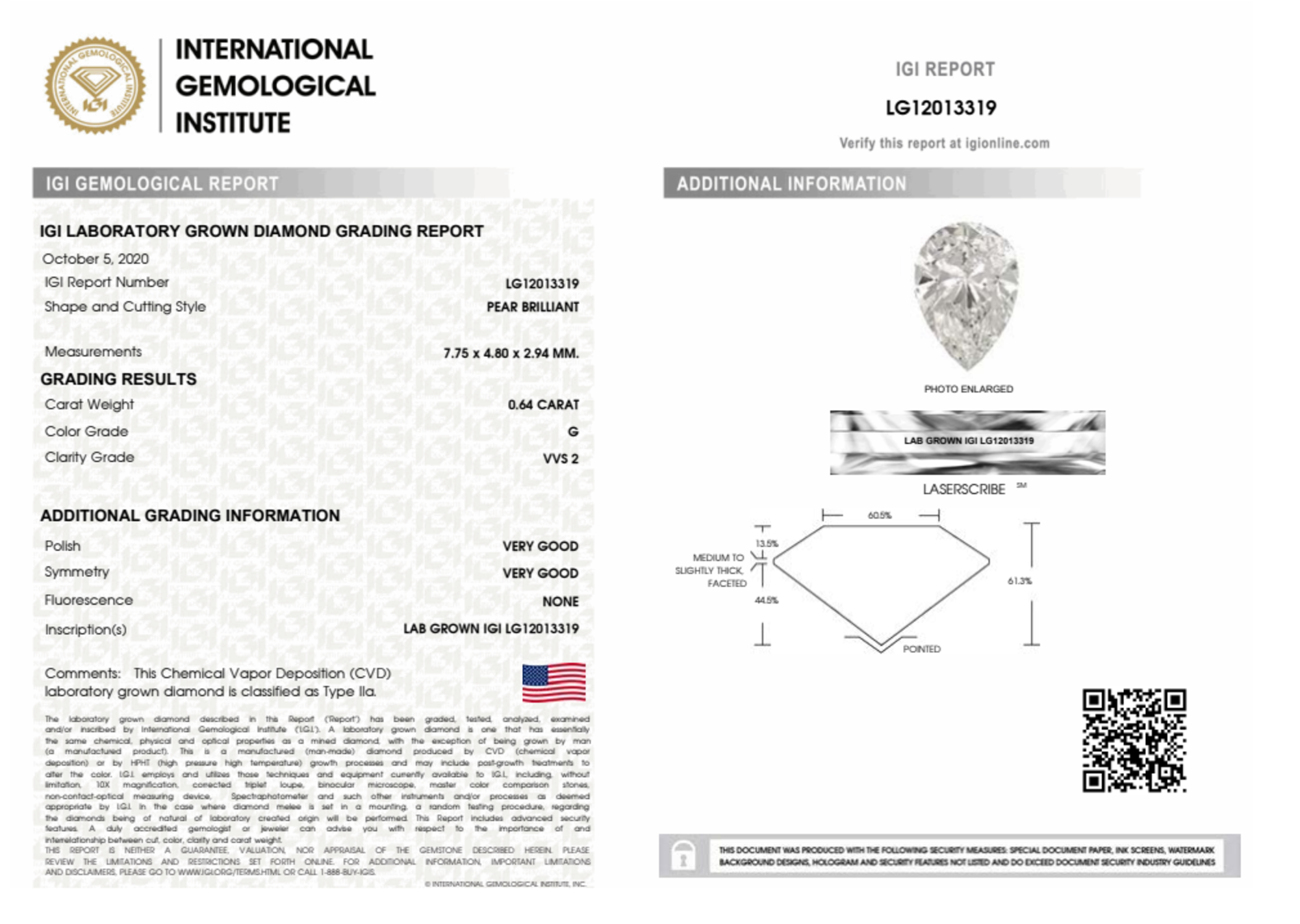 Your 0.64 carat Pear lab diamond is graded G color (Near Colorless), and you can read more about G color diamonds here.